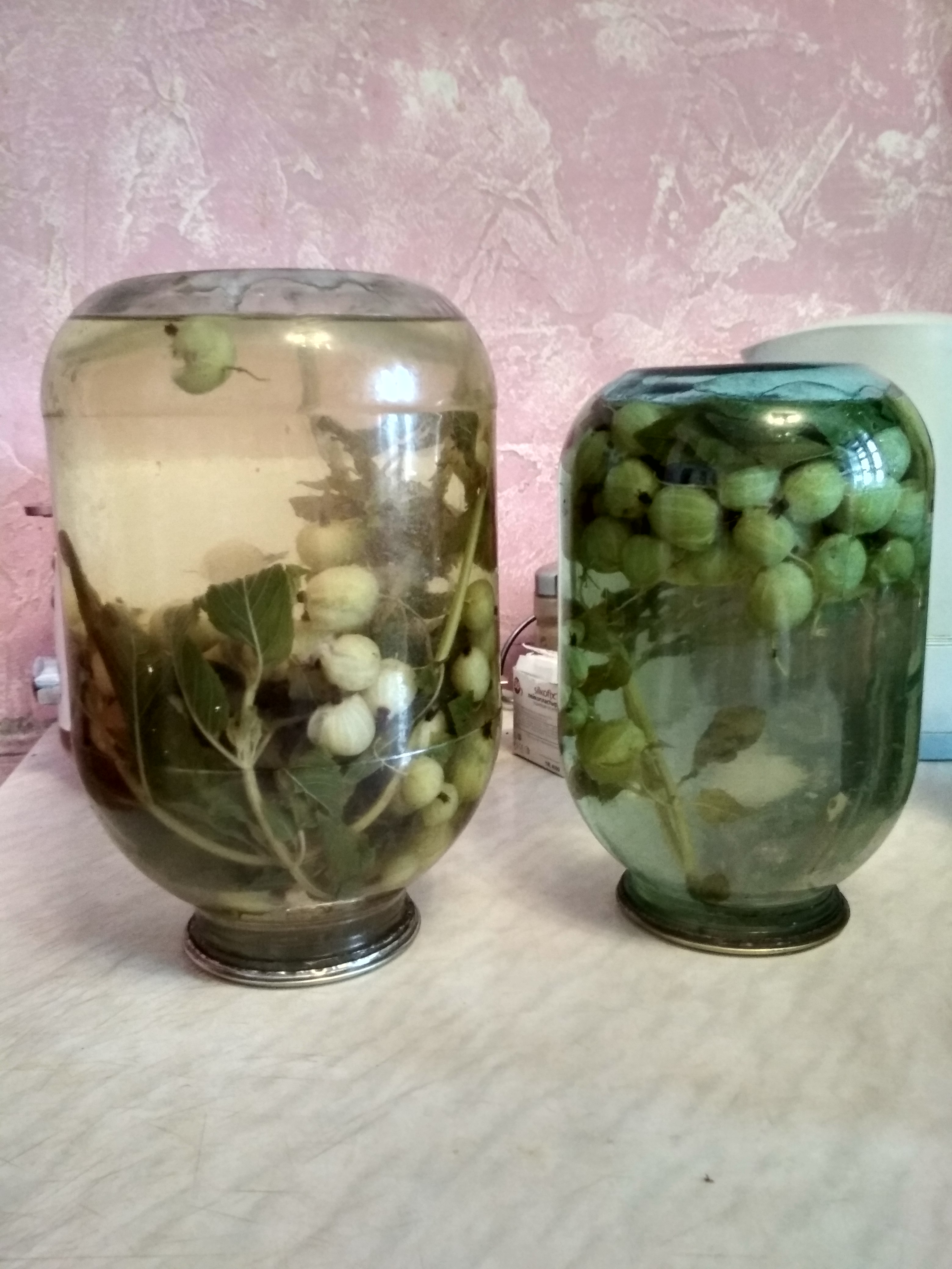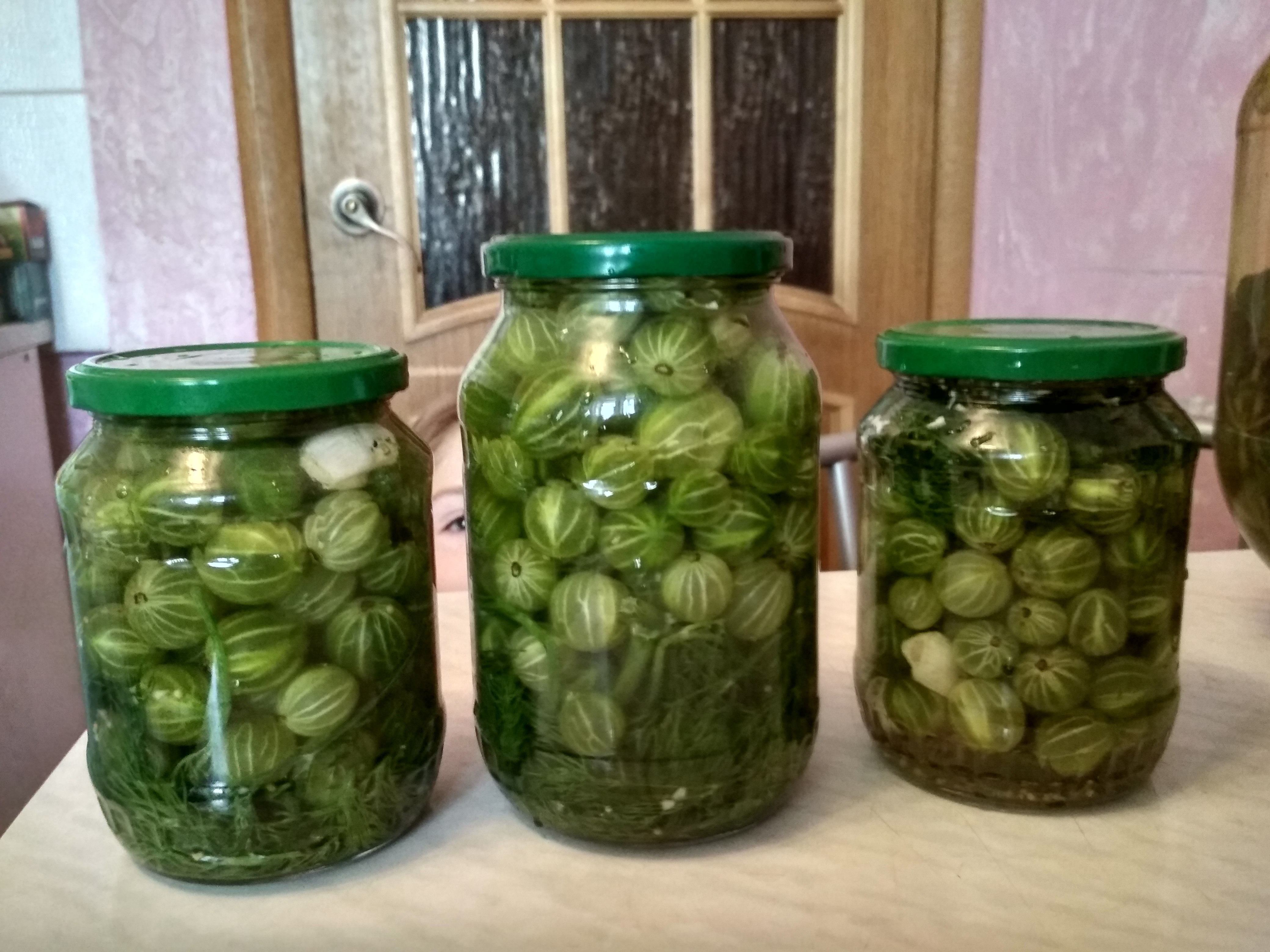Крыжовник лучше твёрдый очистить,сложить в банку вместе с пряностями ,залить рассолом и закрыть обычной крышкой.