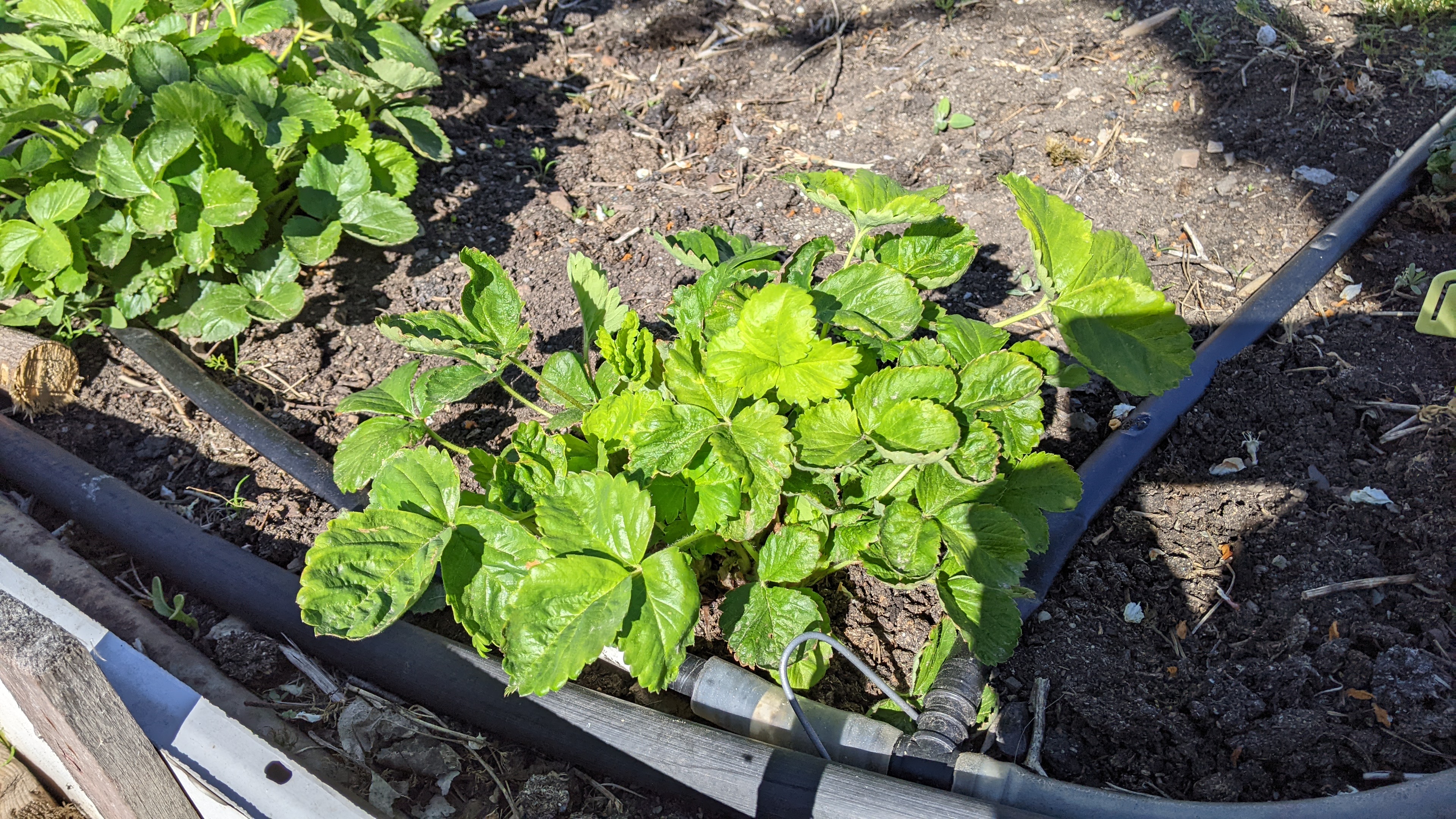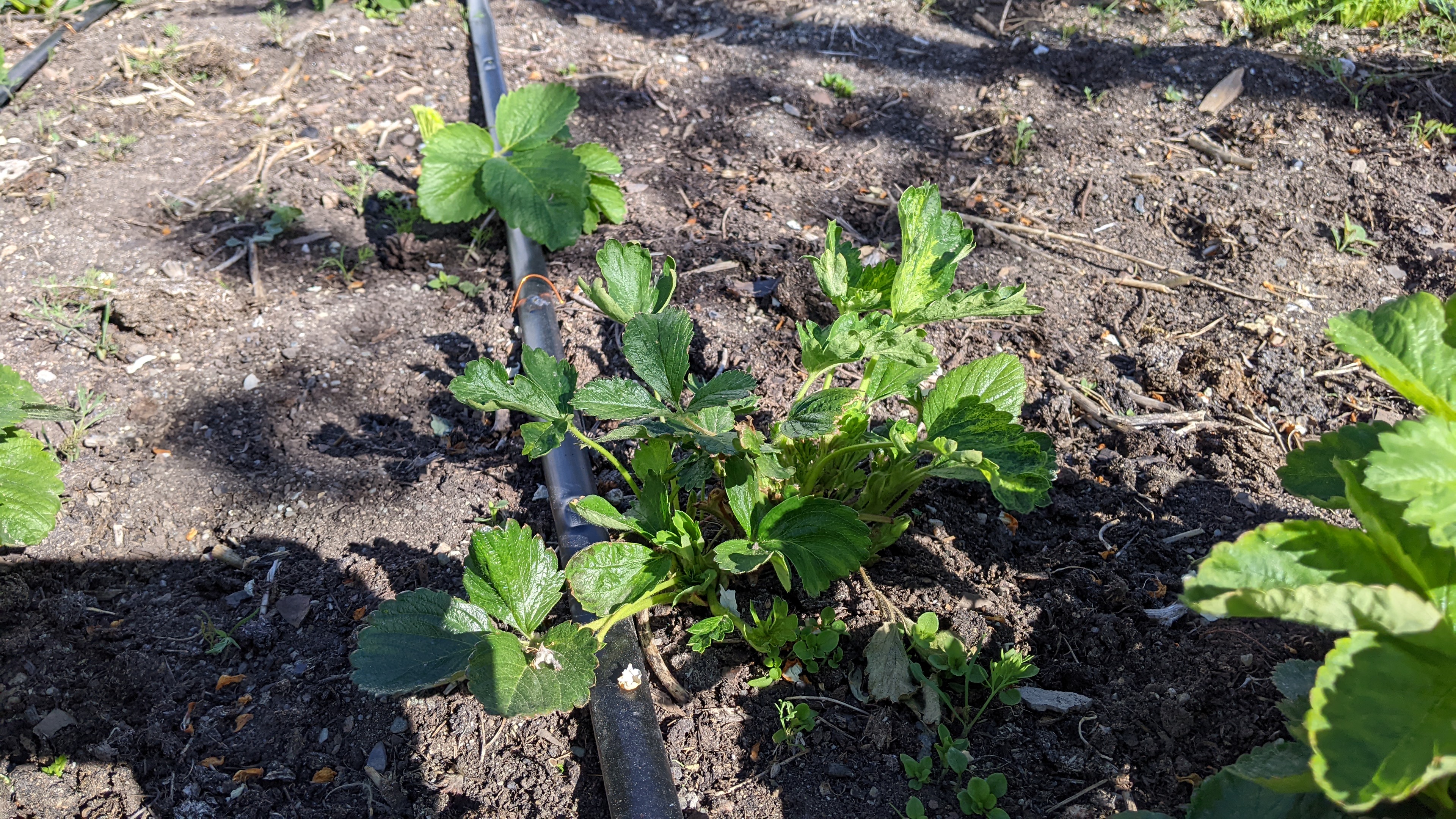 Считаю, что клубника на снимке сильно загущена. В результате, листья синтезируемые вещества в основном направляют на создание новых листьев, а не на плоды. Для нормализации два из трех кустиков убрал бы.
