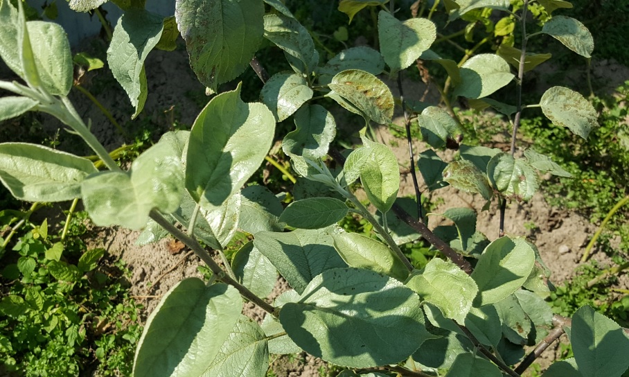 Яблоня сорта "Славянин", возраст 4 года (дом в деревне в Кашинском районе, Тверской обл.) Приехав на дачу в августе я увидел, что листва на этой яблоне стала светло-светло зелёной (изумрудной). На остальных же яблонях листва нормального зелёного цвета. Уход, полив и подкормка для всех яблонь одинаковая. Что это за напасть и как с ней бороться?