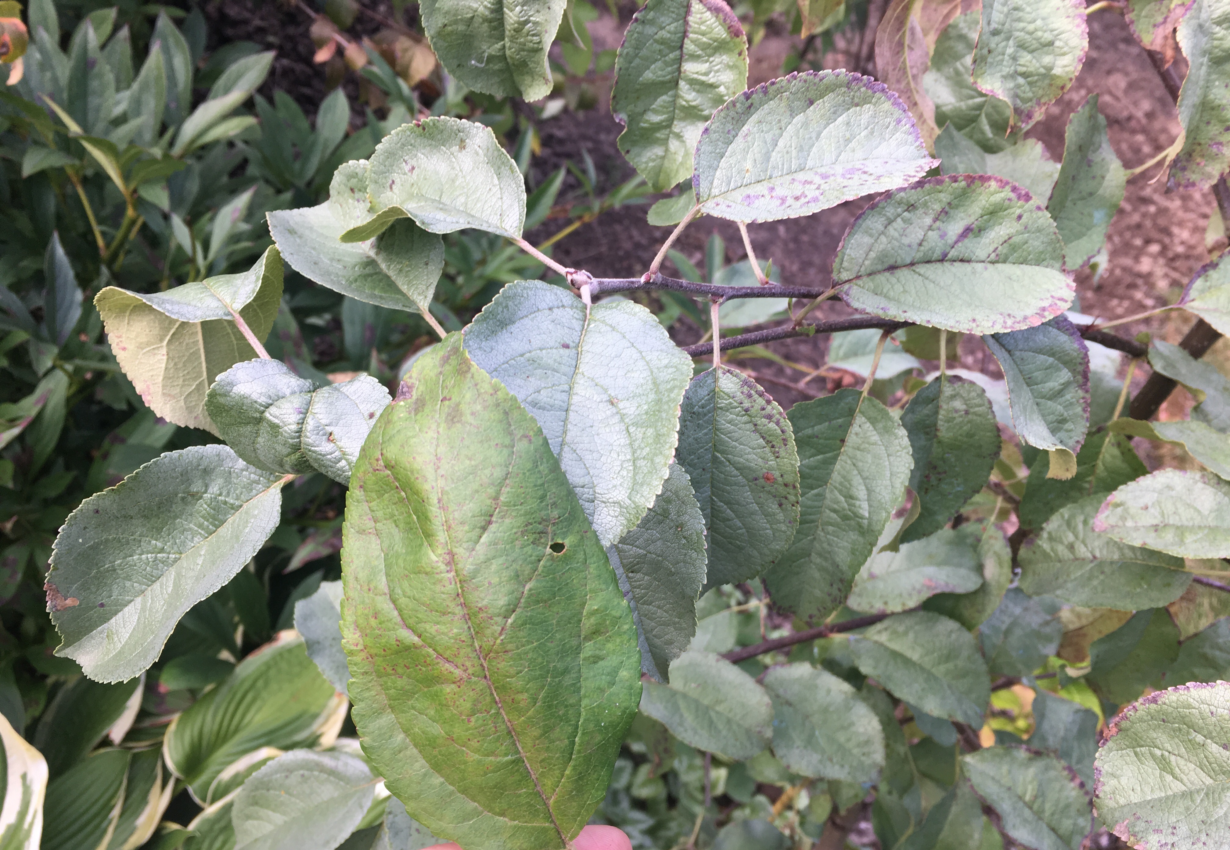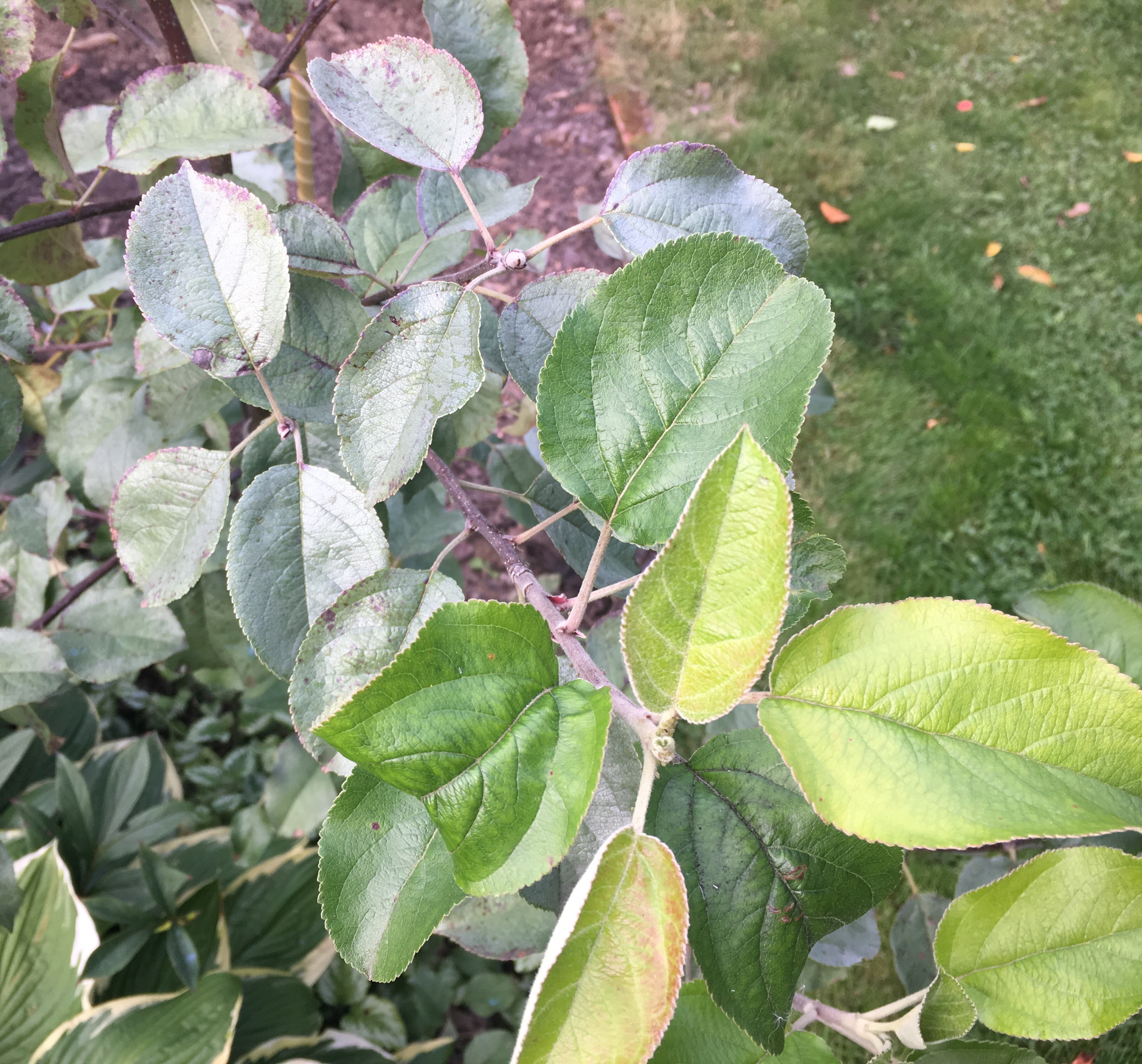 Нужен совет по определению причины изменения цвета листвы на яблоне.