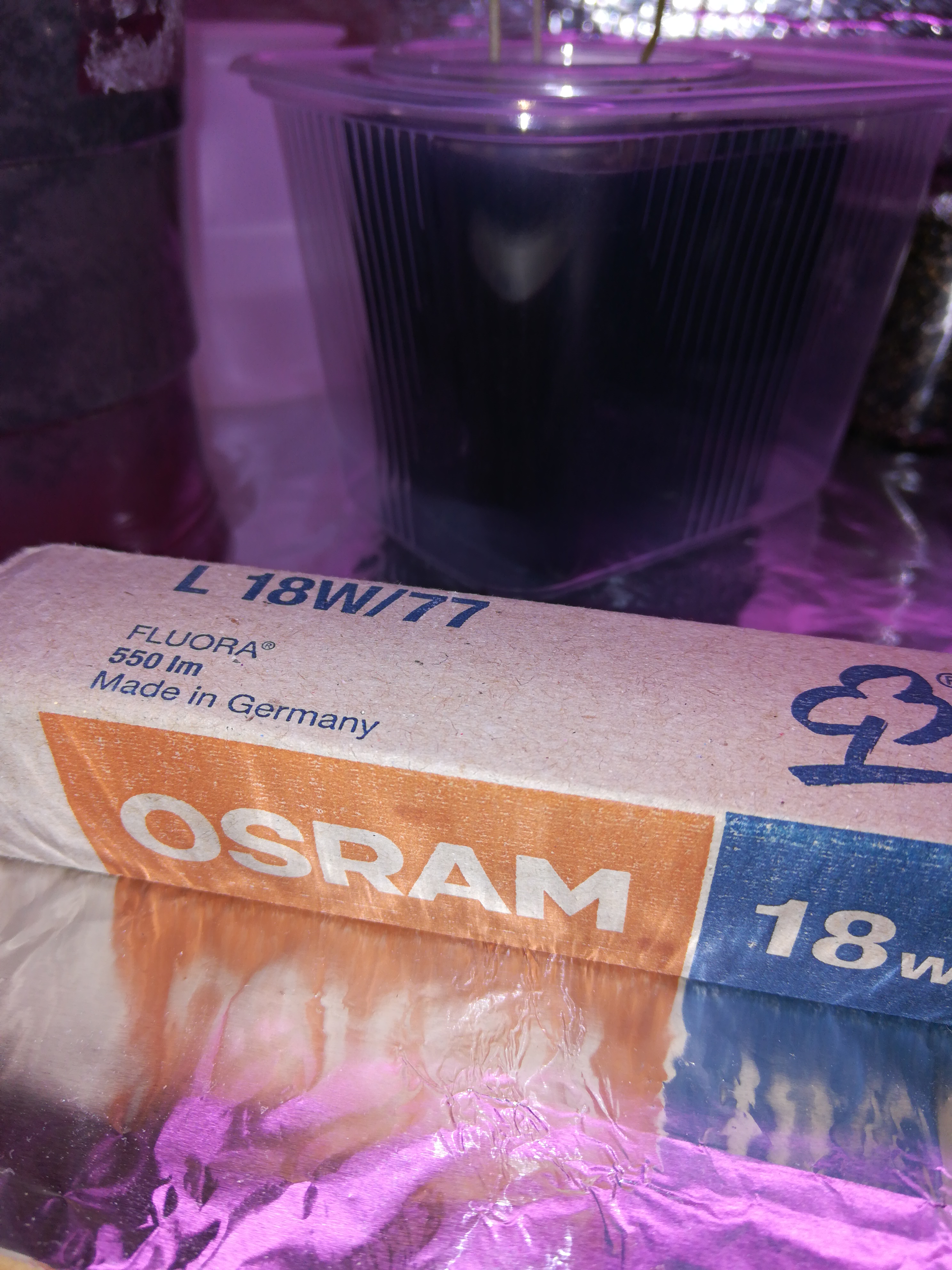 все стояло под биколорной лампой l=1 м, Р=27w (честных). Биколорная, это 2-х цветная, состоящая из красных и синих светодиодов узкого спектра.