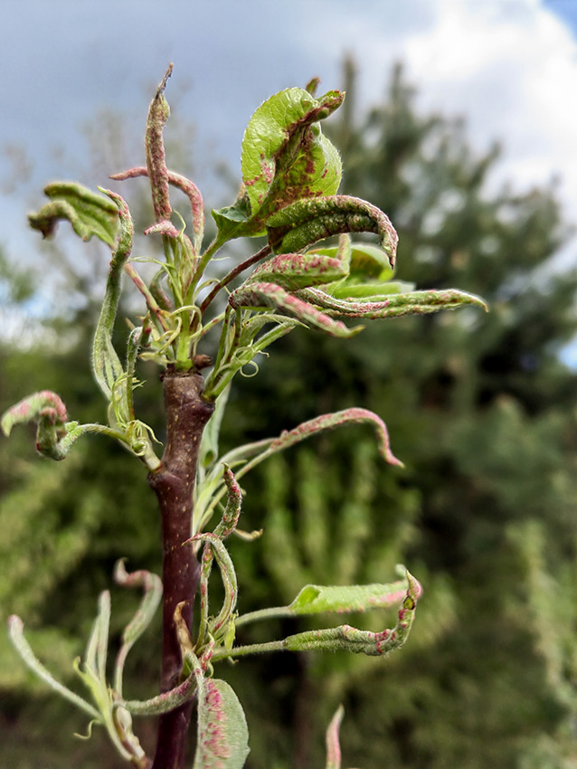 По галловому клещу, в основном чисто , кое где незначительные следы на кончиках верхних веток.Значительные повреждения на Любимице Клаппа, Медовой, неизвестный сорт на Аронии.3.05 обработал все груши Масаем.Заметил, что основная часть яйцекладки весной проявляются на концах побегов, вывод, хорошая классическая весенняя обрезка - один из способов борьбы с г.клещем.Интересное наблюдение, 3й год делаю з.прививки, прививки в крону, не замечал , чтобы на распускающейся прививке была яйцекладка.Сейчас специально прошелся по свежим З.П., листочки чистые.Много двухлетних молодых груш разных сортов на от 0.5 до 1.5м, признаков г.клеща не наблюдаю.Чем это объяснить?