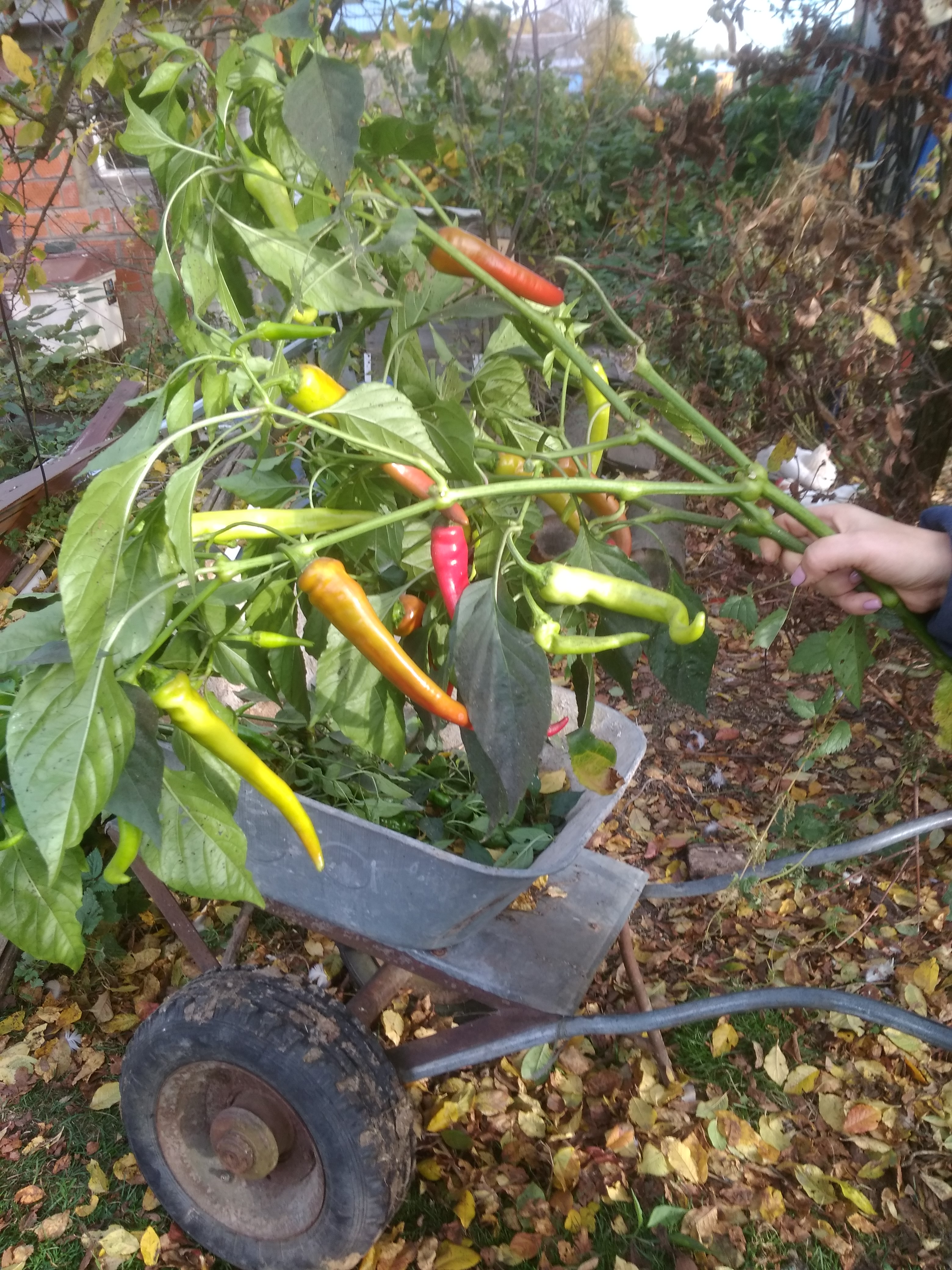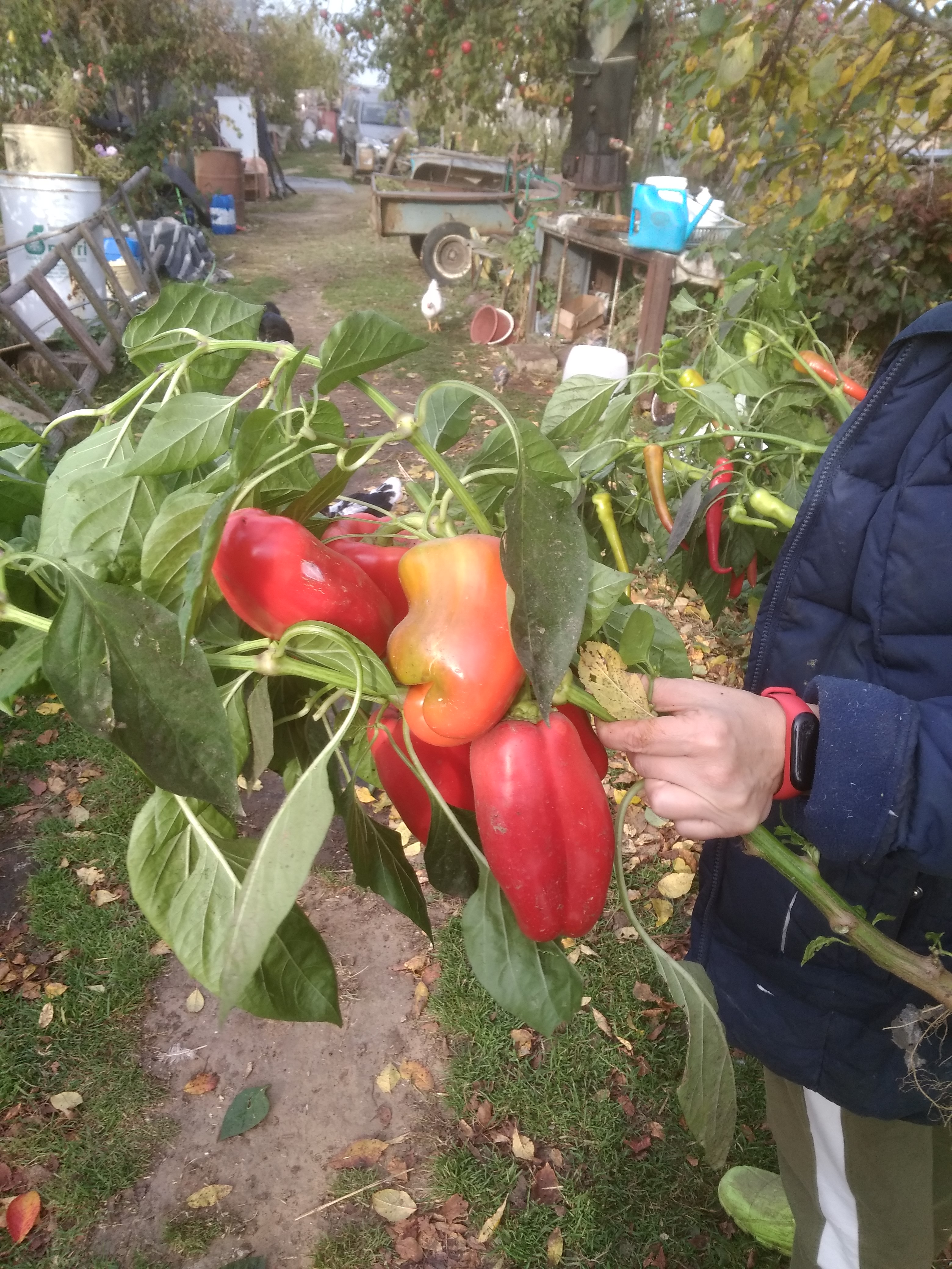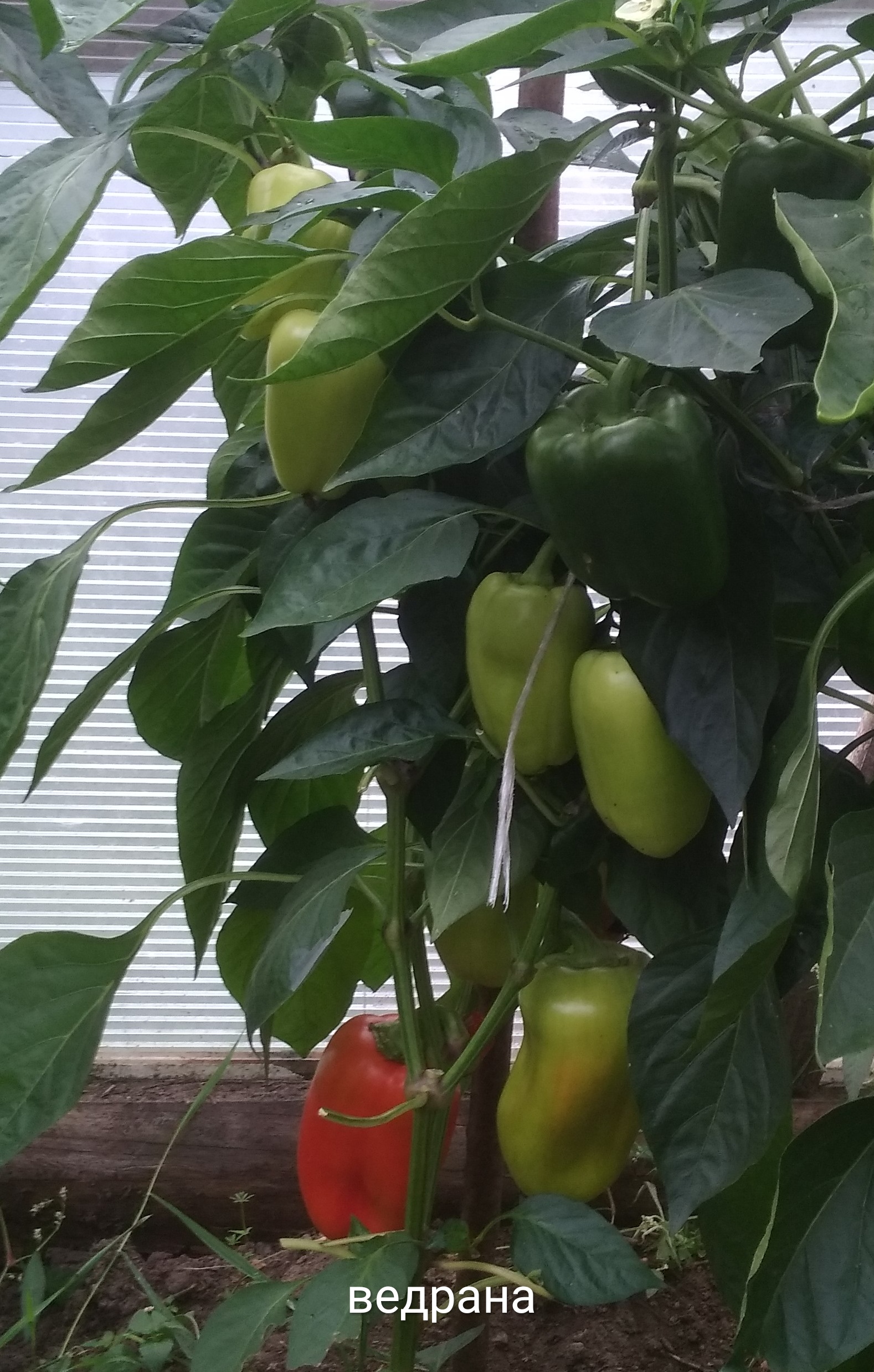 Хорошо старую теплицу не сломал,а подправил и высадили там отдельно перцы. Такое уродило! Вот что именно им для урожая надо я не понял. Толи влага, толи тепло, а может всё вместе... Ломались ветки с перцами, хоть и много раз подвязывал.