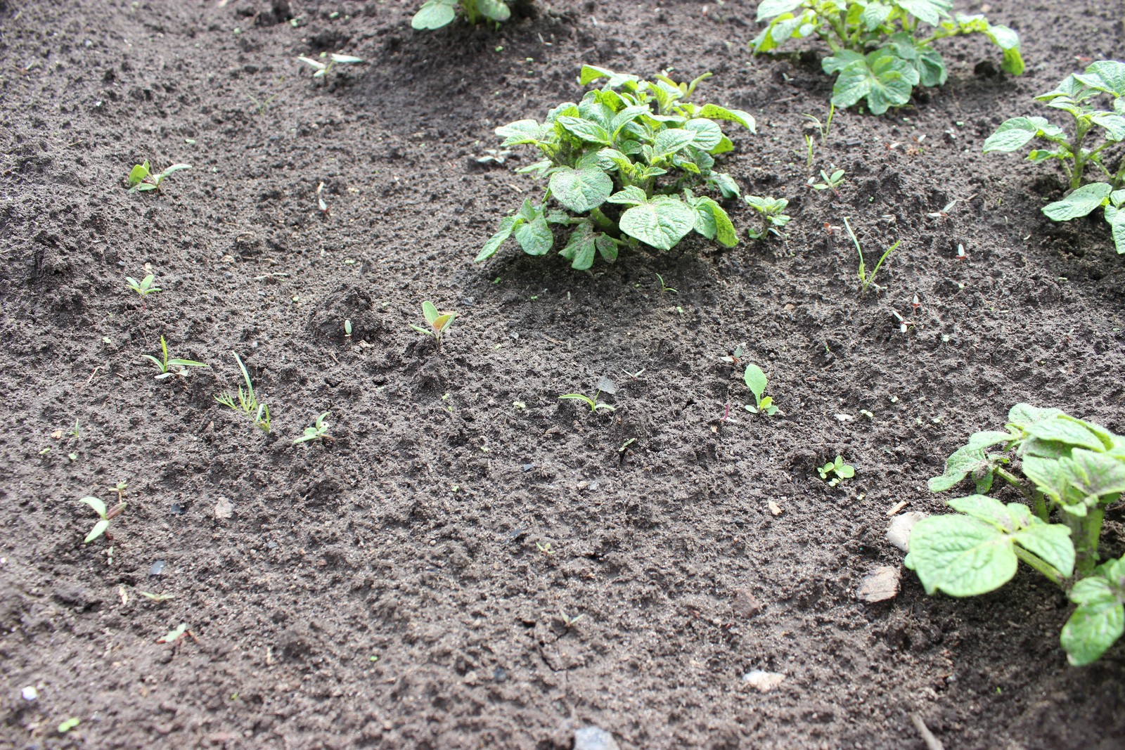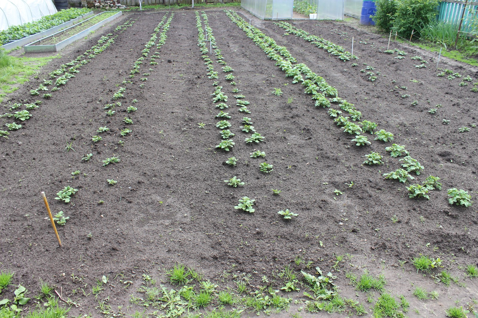 В этом году картошка начинает уже всходить,была посажена 8 мая.В прошлом при посадке 10 мая начинала всходить 28 мая.Погода самое то для всходов,тепло и дожди.На удивление при равном проращивании первый всходит Ильинский.