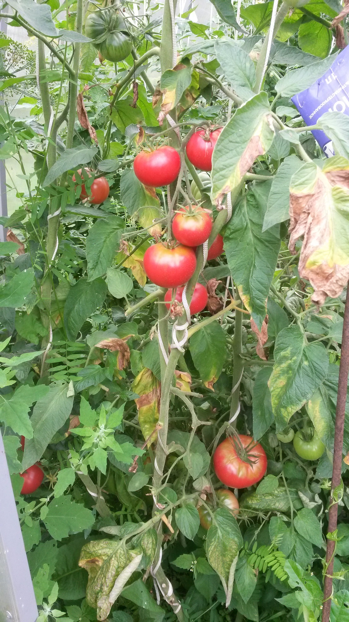 Как не странно, у меня томаты в ОГ выглядят здоровее тех, что в теплице, правда краснеть начал только Монгольский карлик, сегодня сняла три красных помидора. Они у меня вообще стойкие, я их высадила в ОГ, под укрывной, а через несколько дней заморозок, в теплице выдержали, а эти все помёрзли, но я поглядела, что стебли живые и оставила, не стала выдёргивать, только всё мёртвое обрезала, ни одного листа не осталось, только палки одни, решила посмотреть что будет. Такие сейчас кусты шикарные, но окрашиваться только-только начинают. Погода помогает, конечно.