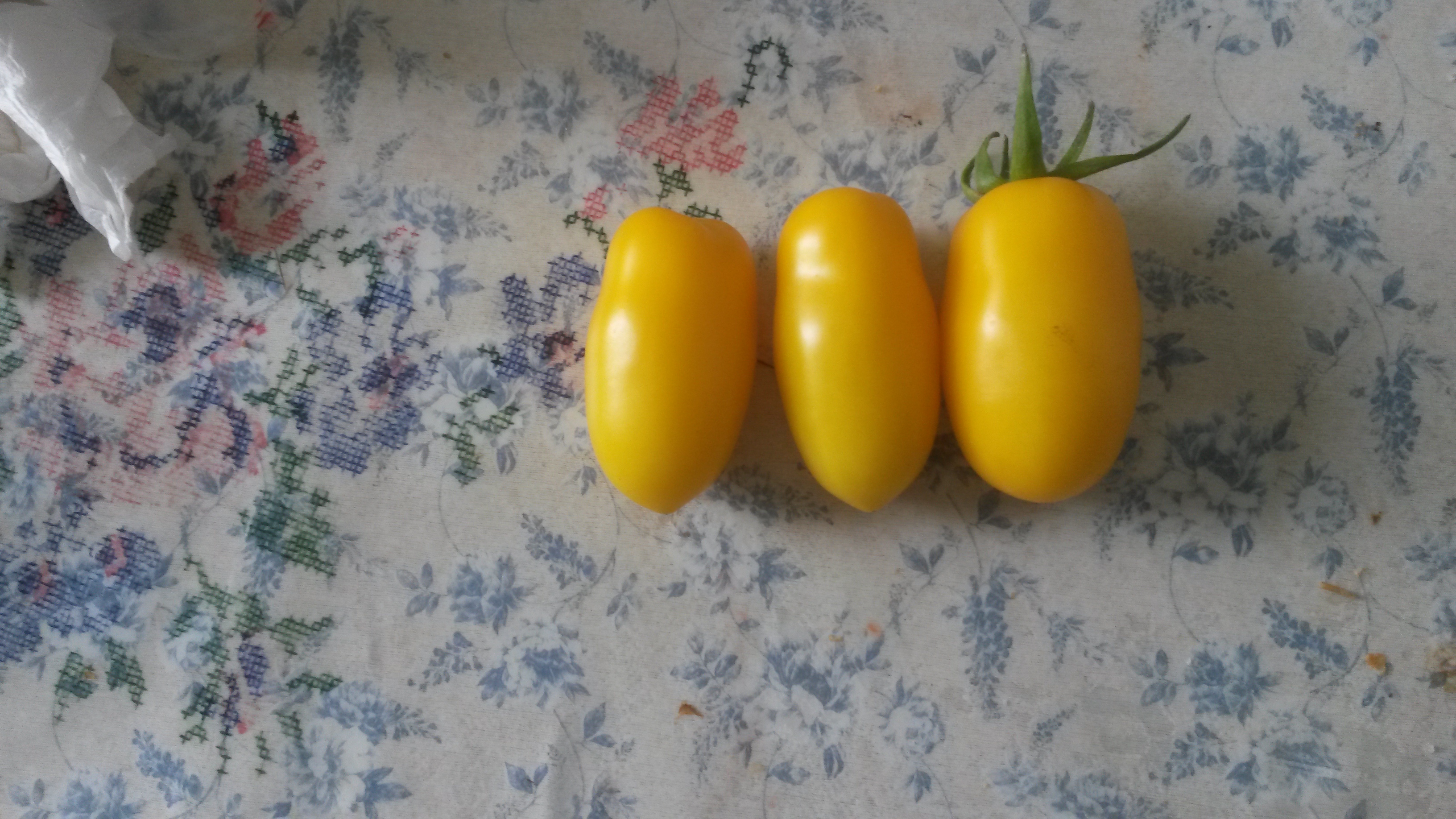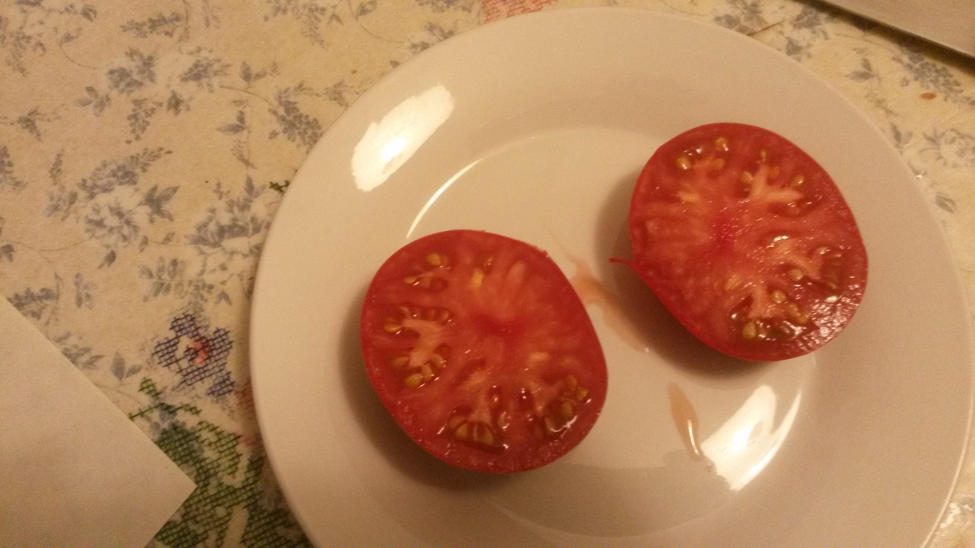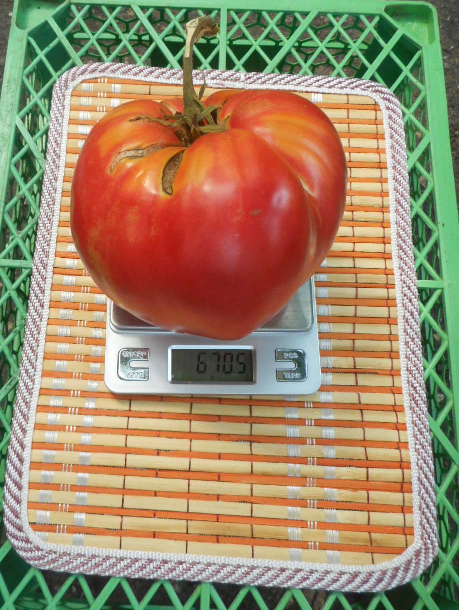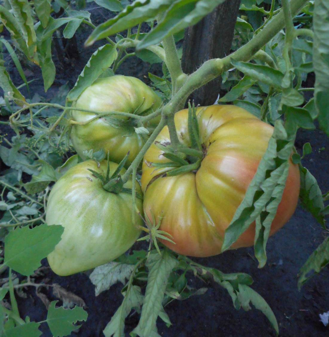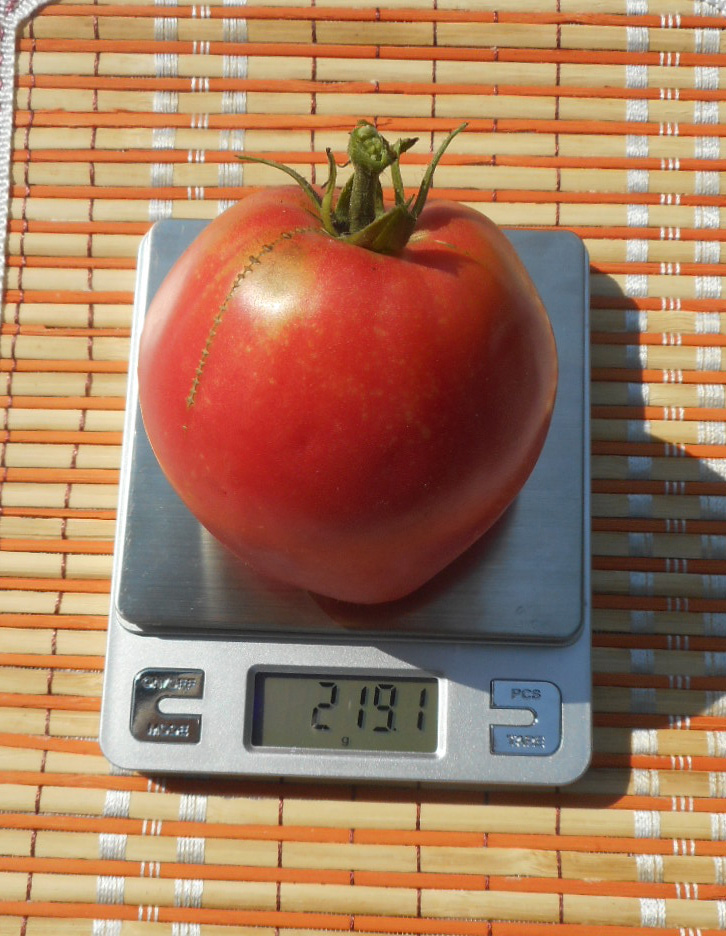 Плоды плоскоокруглые, с поздно исчезаюшим зеленым пятном у плодоножки, семенных камер - 4-7, семян много, кожа не съедаемая, трескучие. Первые были грам до 500г, последние по 75-100. Вкус яркий истинно помидорный, очень сладкий (как будто томат не посолили, а посыпали сахаром), насыщенный.