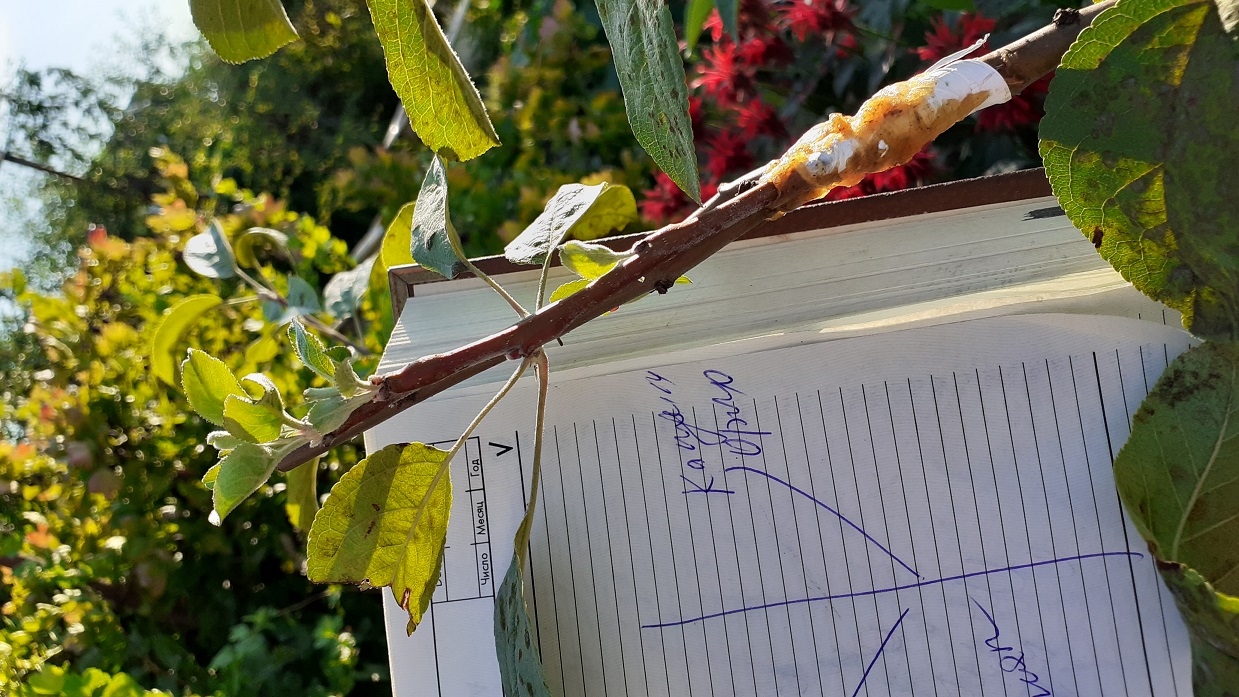 А вот последствия процесса очень не понравились - приживаемость моих прививок ок. 5%. Полный провал. Причины пока не могу понять: м.б. много древесины на щитке оставлял; м.б. зря подвойную ветку срезал.