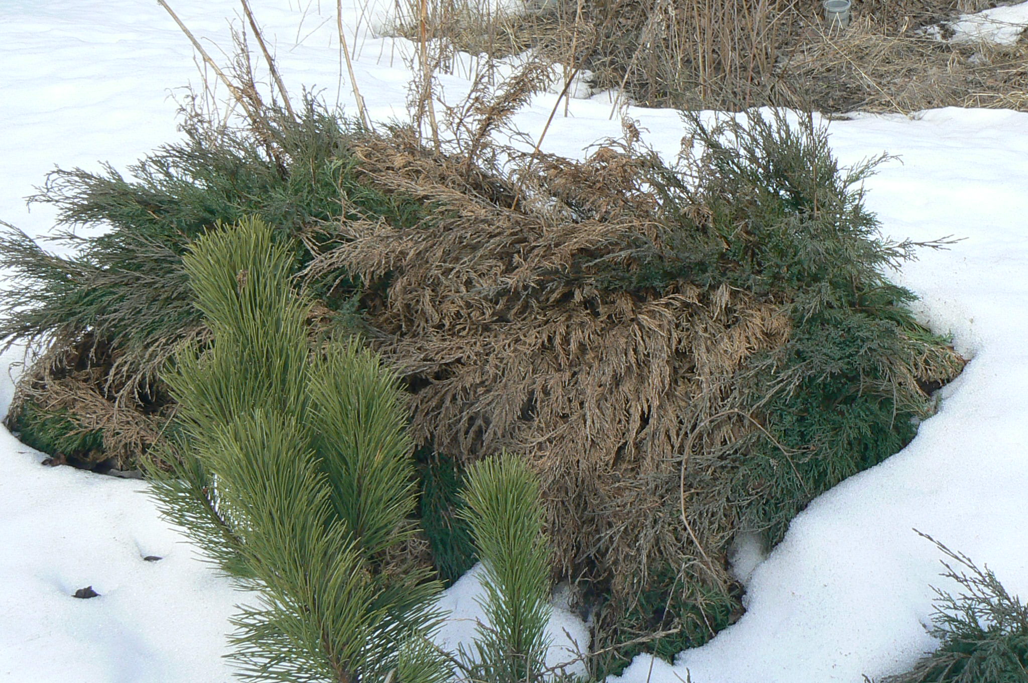 Лен, когда после жаркого 10 года у меня подгорела хвоя даже на старых кустах обычного лесного можжевельника, я поняла ,что надо их поливать под зиму или очень рано весной( еще по снегу). Теперь под зиму поливаю вместе с рододендронами, т.к. у родиков слабая корневая и им без водички никак...А иссушение хвои бывает еще зимой от ветра, солнца,недостатка запасов влаги. То, что сейчас- это последствия чаще всего. Ничего не обрезала и не убирала из деревьев с южной стороны?