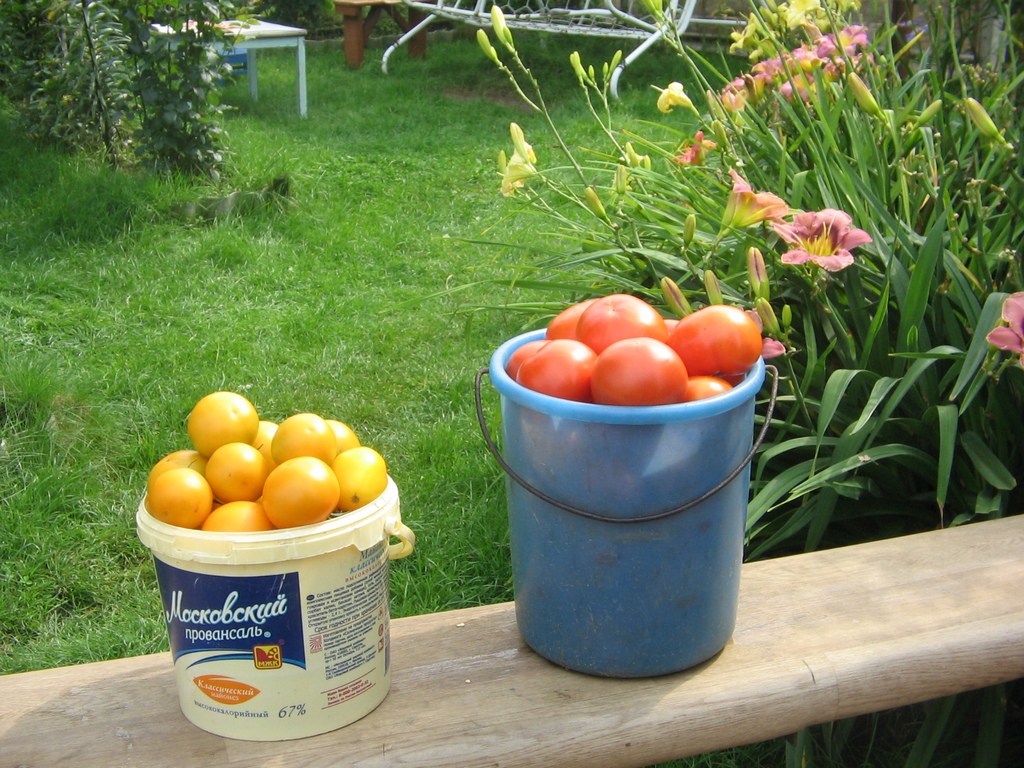 Если кто любит желтые(оранжевые томаты) , рекомендую попробывать гибрид от Семко Диоранж. По соседству с ним красный , крупноплодный гибрид от Семко-Малвазия. Из желтых на мой вкус первый по урожайности и вкусу обходит Хурму, Руслан, Монастырскую Трапезу. Других желтых пока не пробывал.