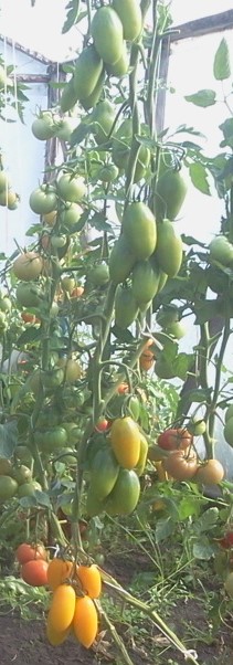 Рост получился 160-170. Вкус поначалу не впечатлил-кисляк. Но когда помидорки начали зреть на кусте и повисели под солнцем, набрали сладость и аромат. Чисто помидорный аромат, кисло-сладкий вкус.