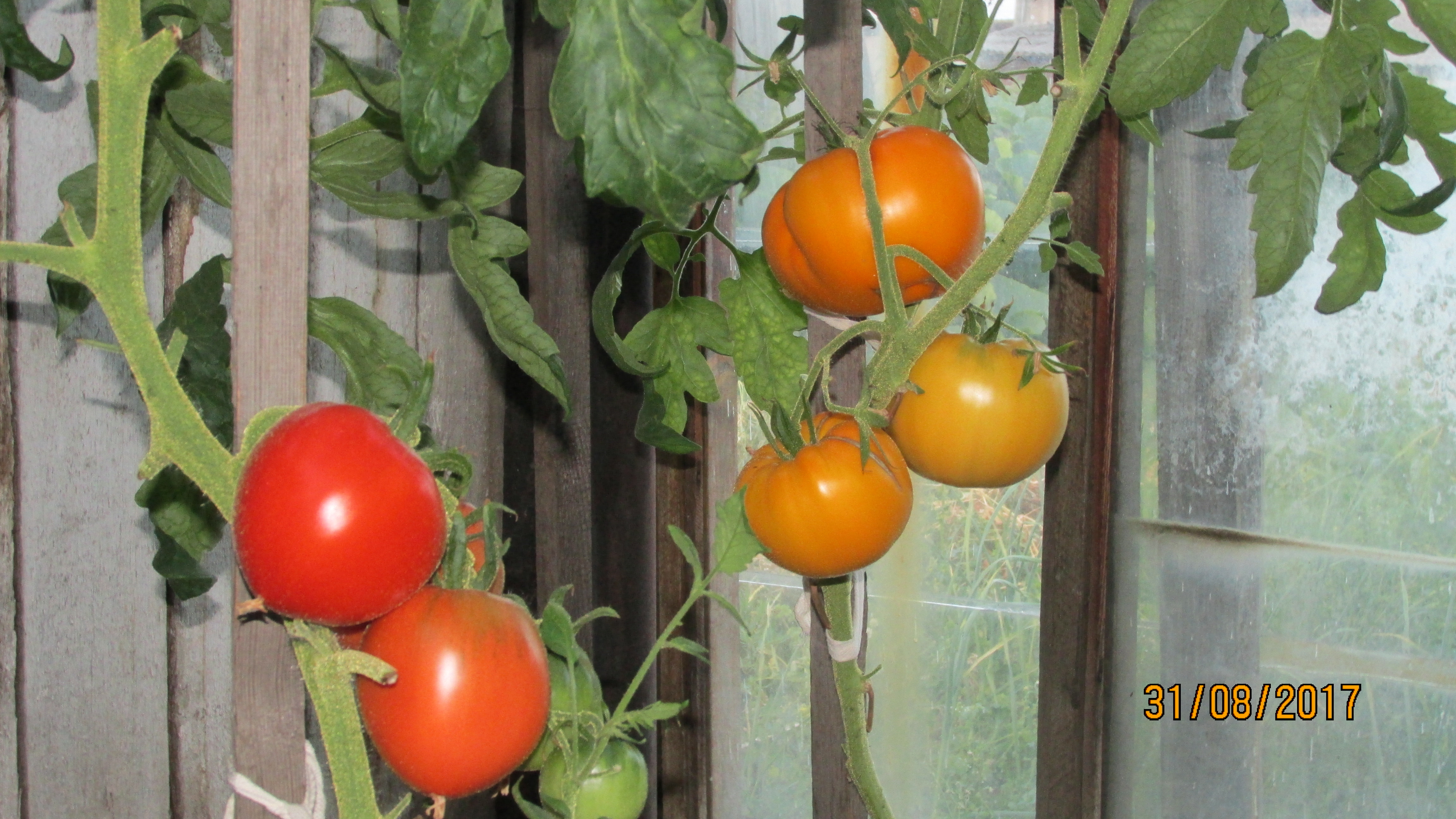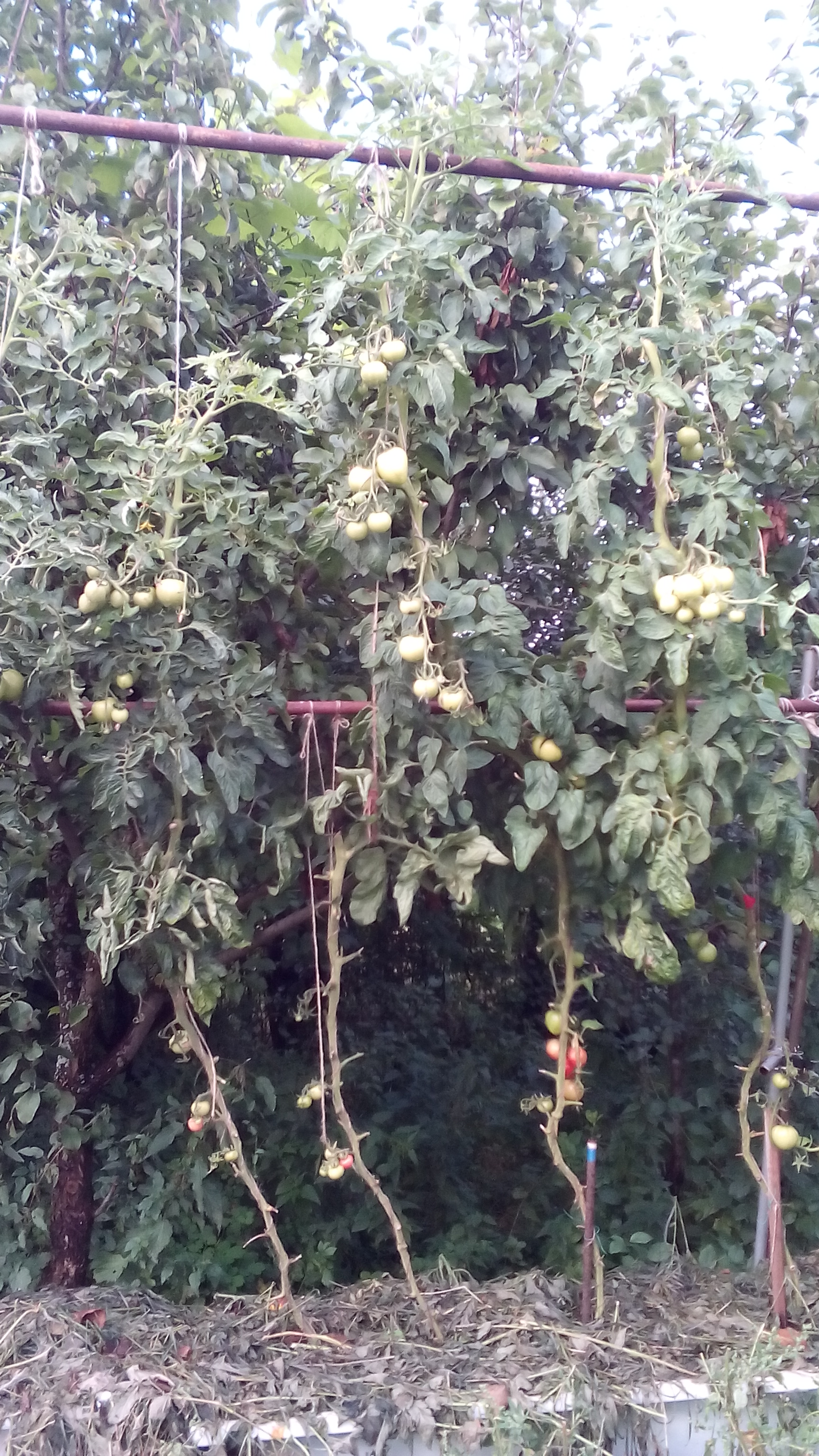 А вот мои томаты. До конца недели ещё лето, не снимаю ещё. Поспели, но пусть висят, руки до заготовок никак не доходят