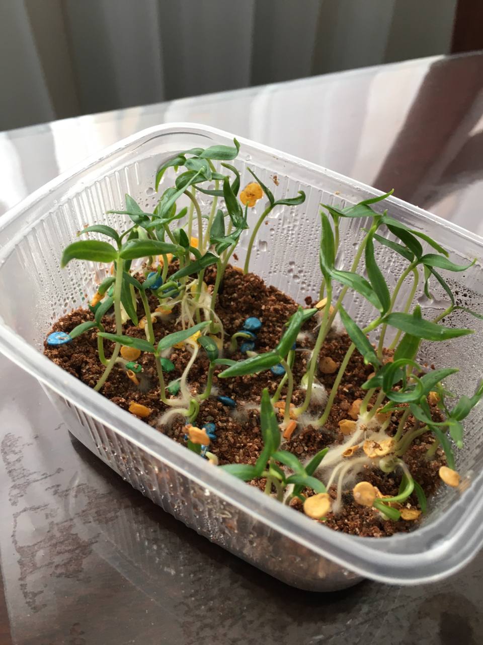 Вот фото перцев посеянных на вермикулит в пластиковой коробочке под крышкой, оставленных на 2 недели на время отпуска без присмотра. Томаты я бы не стала держать до семядолей, они сильнее вытянутся, но принцип понятен.