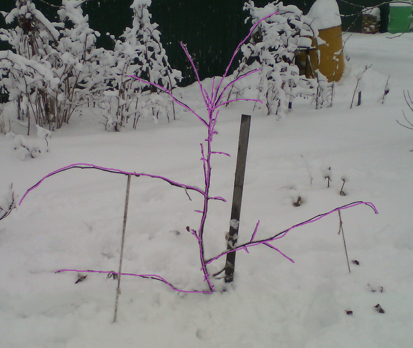 Так было. Коричное полосатое.19 января 2019. Так стало.2 февраля 2019года. Такая история. До Коричного, когда ещё не сад был, а голое место, и гуляли клинские ветры, дважды сажали на это место яблони. И дважды они получали морозобоины. По нашей вине, отчасти. И их вырубали. Поэтому сажали сразу два саженца Коричного "гнездом". Если у южного случится морозобоина, то я её вовремя должна вычистить, а ствол выше снятой коры должен был снабжаться водой и минералкой, которые бы подавались через привитую ветку северного ствола(предполагала делать аблактировку). Но... не уследила и, кроме гриба Цитоспоры, южное дерево получило ещё и стволовую гниль. Удалили его. А северное, которое формировала как "дополнение" к южному-основному, оставили. Такое, вот, кривое. Нижние ветки - обильно плодоносящие Народное и Анис алый. Чего теперь делать? "Выпрямлять" дерево? Значит, сильно обрезать и убрать будущий урожай Народного и Аниса алого?