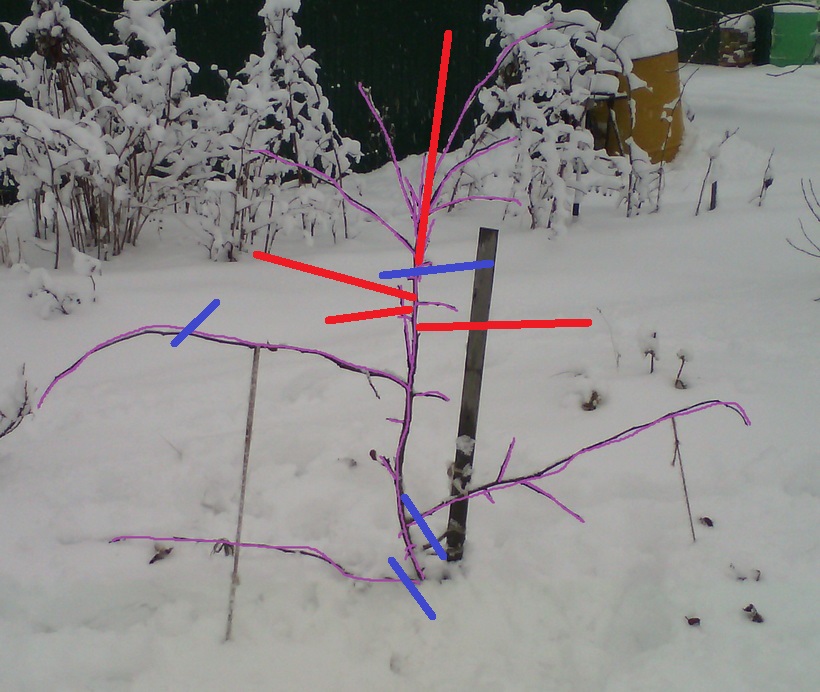 2.по "кривому". Если здорОво, то это главное. Приводите его в симметричное состояние не столько обрезкой, сколь гнутьём. Например, нижняя скелетная ветвь имеет в плане вид "трезубца". Возьмите ближнее ответвление и нежно(как позволяет) оттягивайте на себя и на левую сторону дерева. А дальнее ответвление также нежно в сторону домика и затем влево. В горизонтальной плоскости. Не насилуя, опасайтесь расщепления "трезубца". Года за три переведёте их на левую сторону, не снижая плодоношение. Верт.волчок, отходящий от основания нижней пр.ветки поверните также налево.
