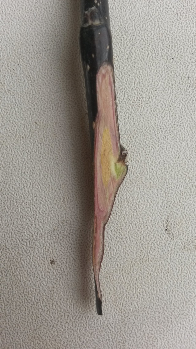 Не делается ли косой срез между двумя смежными почками, от одной почки к другой, чтобы пошли в рост обе, с целью впоследствии выбрать лучше расположенную ветку? Только на 4-5 летней древесине эту спящую почку разглядеть проблематично.