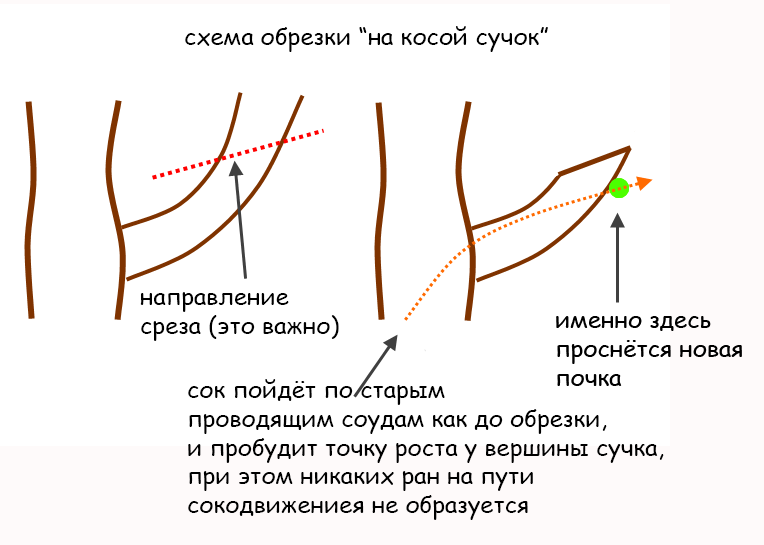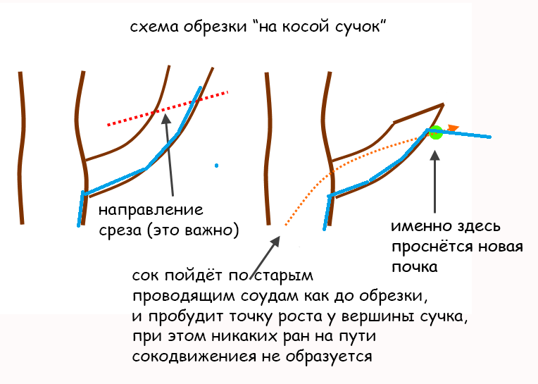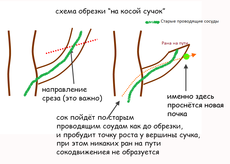 Я нарисовала зеленым "старые проводящие сосуды", и какой срез не делай - на пути их получается рана. Очевидно, что и почка пробудится при любом срезе... Вопрос - зачем косой?