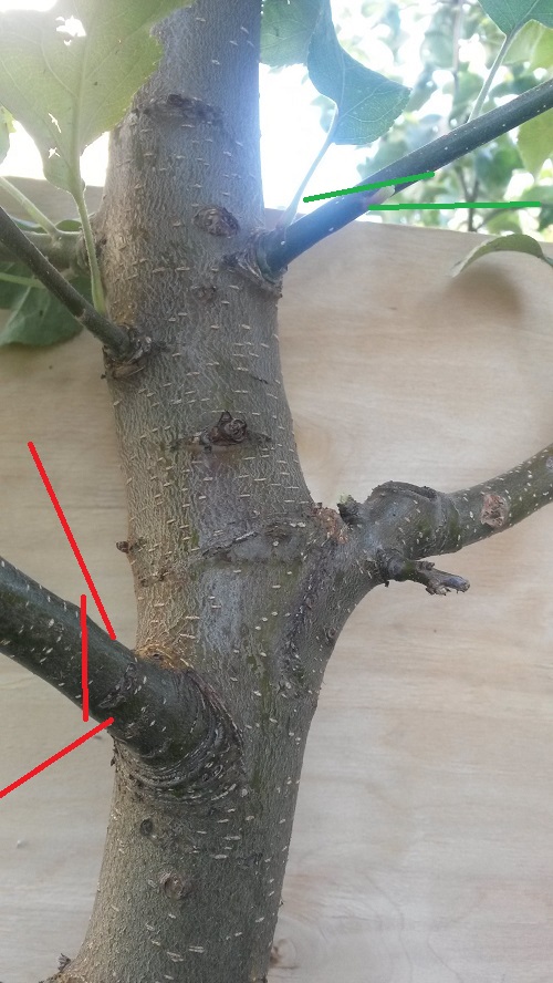 Болат, на мой взгляд слишком малое расстояние между деревьями для этого сорта. Кругом обведен срез-нельзя делать перевод на однолетний прирост удалив при этом годовое кольцо - вызовет ветвление а вам в данном случае нужно плодоношение. Ветки которые по толщине и угду отхождения вырезаются показал красным. Вообще на мой взгляд и сам сорт довольно сложный. Вообщем испытывать тут много надо. Серъезный труд и время.Болат писал(а):Листая интернет, осмелился сделать обрезку, трёхлетним яблоням.