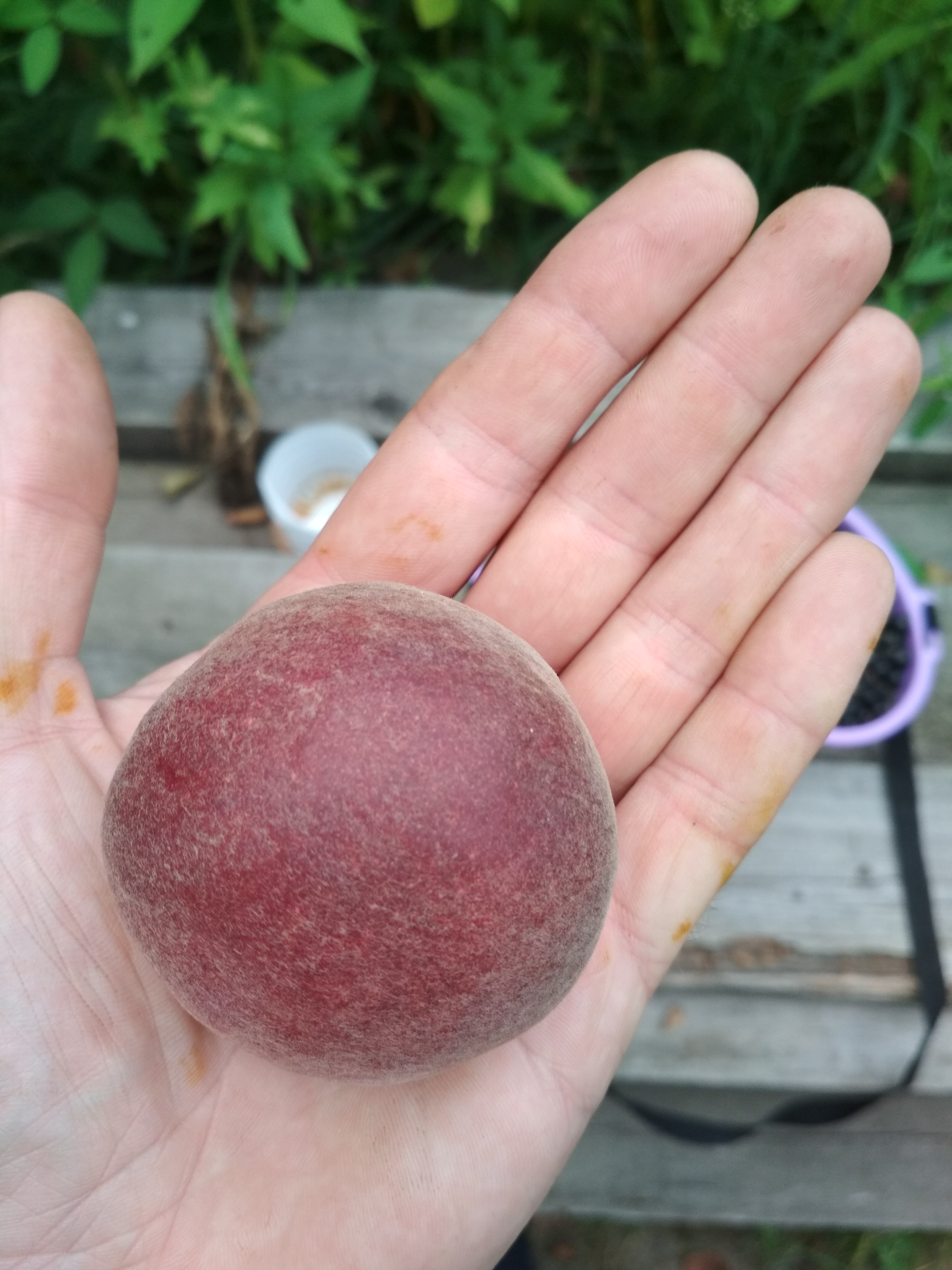 Первый созрел латвийский сорт Викторс на двухлетнем растении, привитом на абрикос. Не понравилось что косточка не отделяется совсем, да и мелковаты. Завязей было штук двадцать, но без нормального полива почти все отвалились, осталось 2шт.