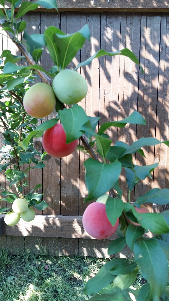 Начал созревать Красный шар. Очень вкусные плоды. Созревает не равномерно. Почти не опадает. Сегодня впервые видел как бабочка из сливы сок пила. Поэтому то и опознал что созрела