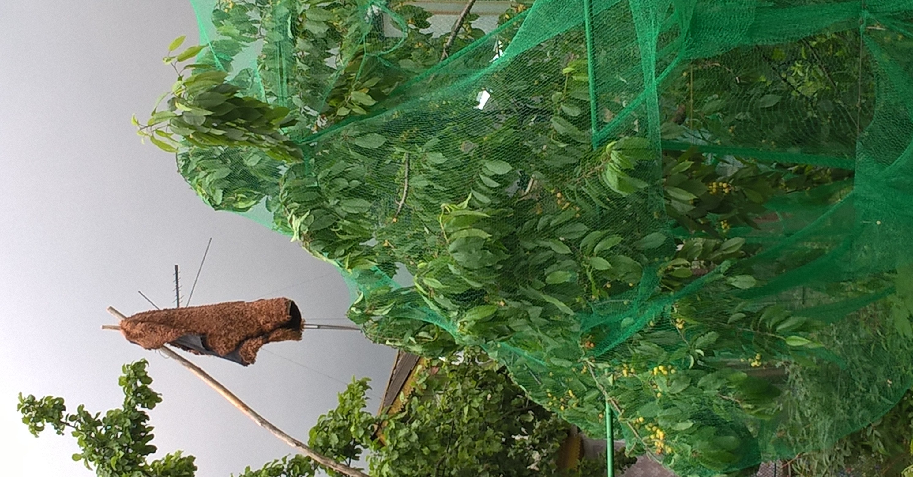 Сетку покупали в оби, года 3-4 назад, она у нас уже вся в дырках, их там аж три штуки. Сейчас нужно перекидывать на вишню, Сания начала наливаться. Иначе останешься без вишни. Сметают вмиг.