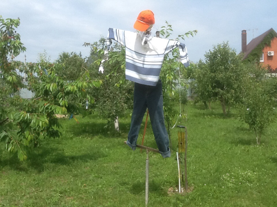 Вот такой товарисЧ встал на вахту вчера. Стоит на мет. шесте, там еще пружина и он от ветра раскачивается и слегка как бы "подпрыгивает", китайская игрушка, бубенчики)), валявшаяся в шкафу лет 10, тоже пригодилась - привязали к руке, звенит.
