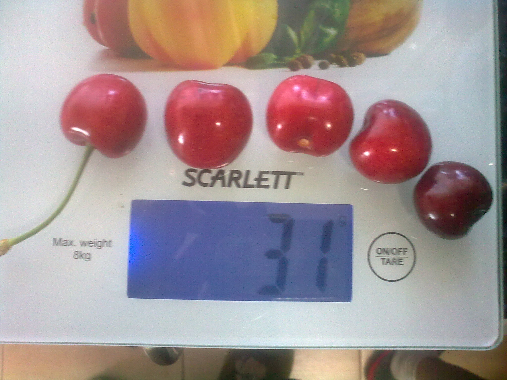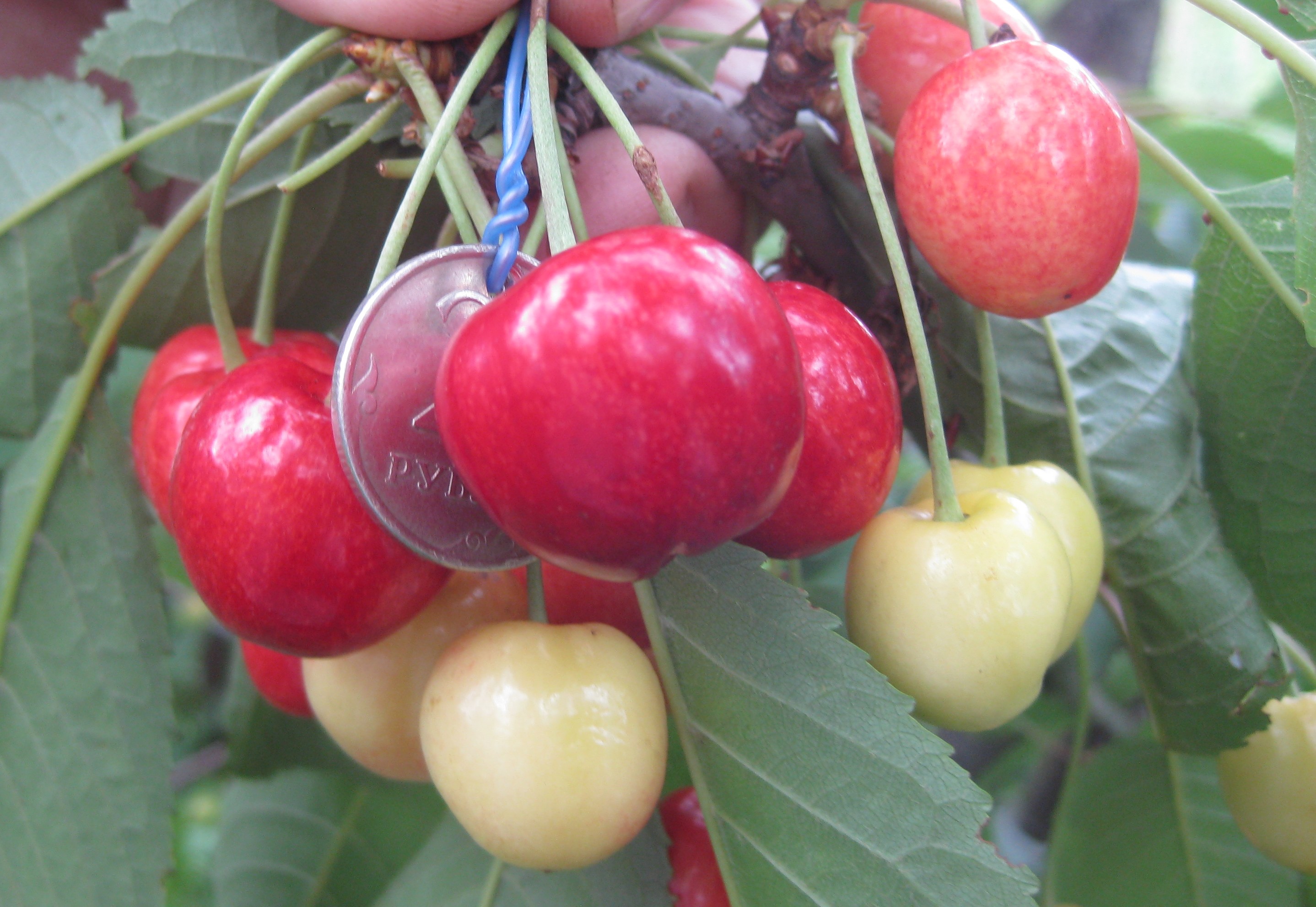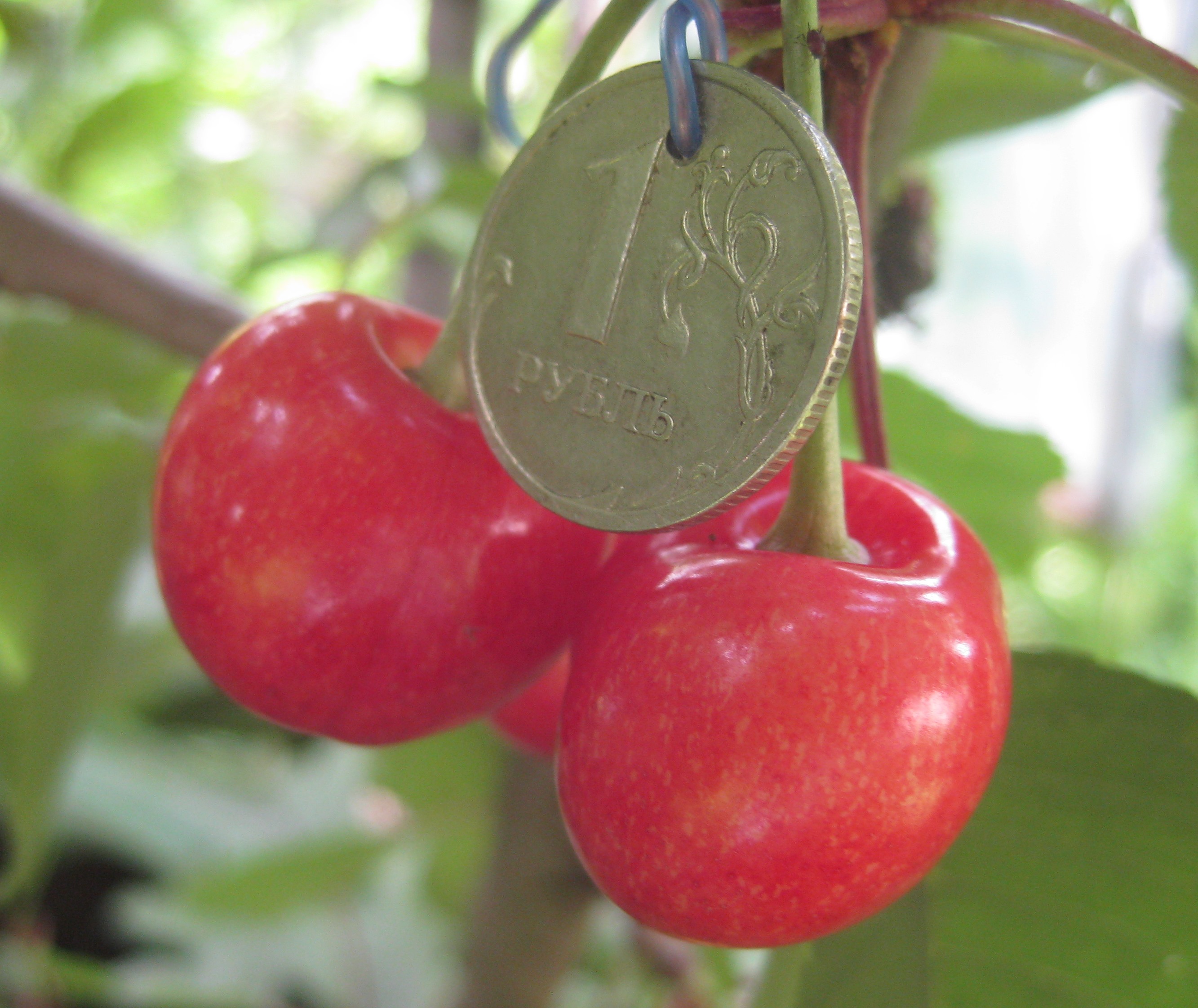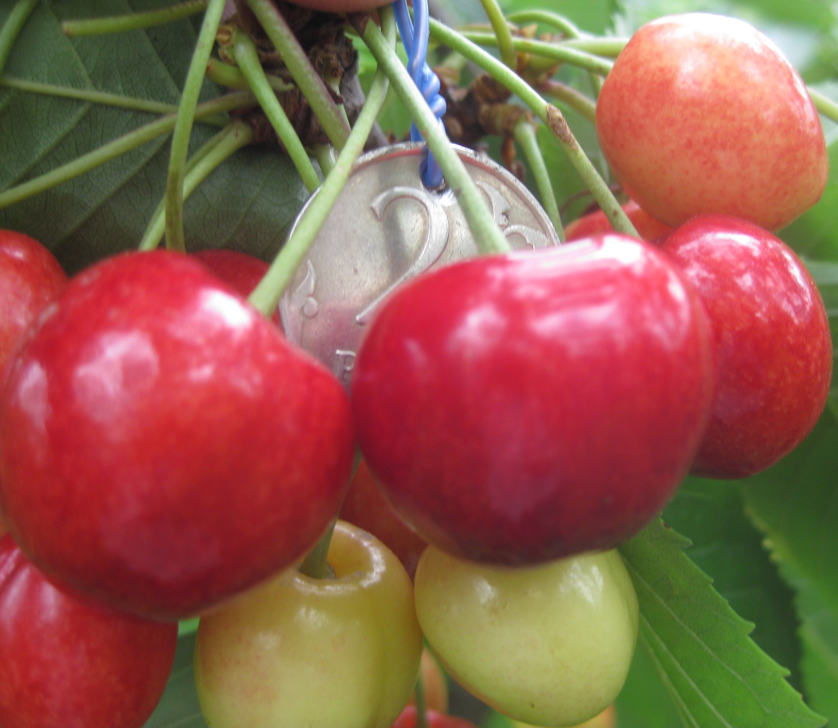 Созревают плоды новых для меня сортов черешни, названия которых не знаю и садовод, у которого резал черенки названия сортов тоже не знает. Меня поразила хорошая зимостойкость деревьев, переживших зиму 2010г. В этом году первое плодоношение. У одного сорта плоды размером с 2-х рублевую монету, с плотной, хрящеватой мякотью. Растение зацвело первым в саду и только через несколько дней зацвел сорт Подарок Рязани, поэтому плодов завязалось мало. Но П.Рязани еще зеленая, а этот сорт уже съедобный. У второго сорта плоды немного помельче – с рублевую монету, но более вкусные.