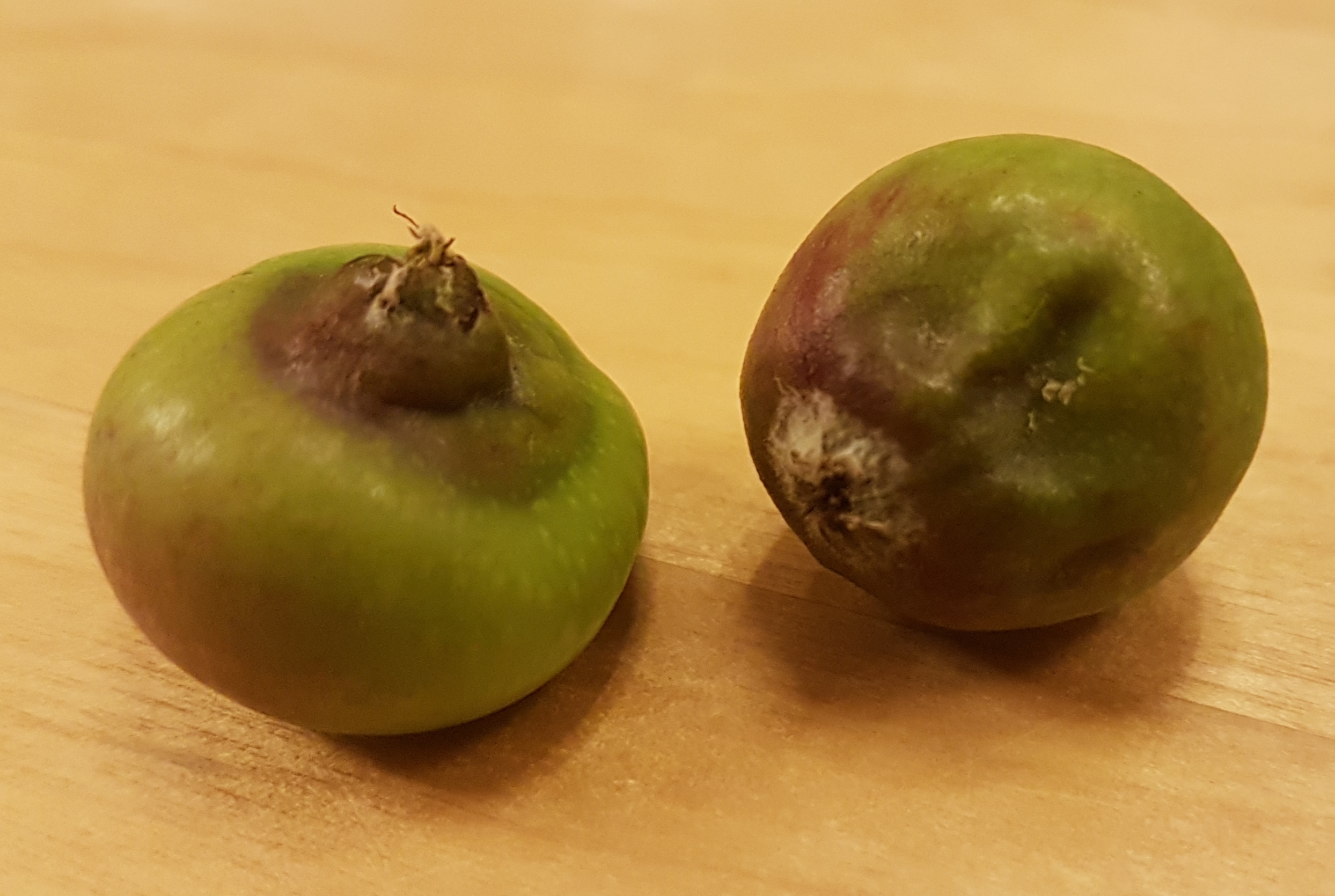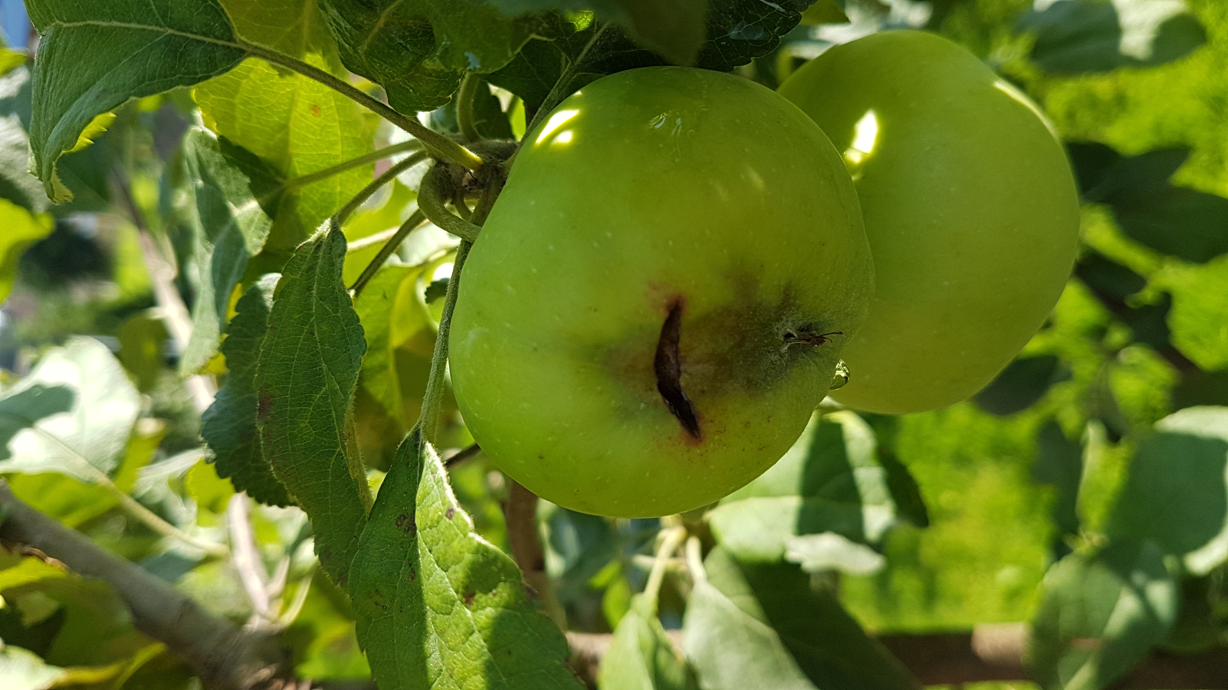 Помогите, пожалуйста, определить, что за напасть такая на яблочках. На разных сортах одинаковая картина. Появляется красноватое размытое пятно (всегда в нижней части завязи), деформирует плод и как бы капсулируется - т.е. не развивается. Яблоко растёт дальше, не гниёт и только трескается в месте поражения.