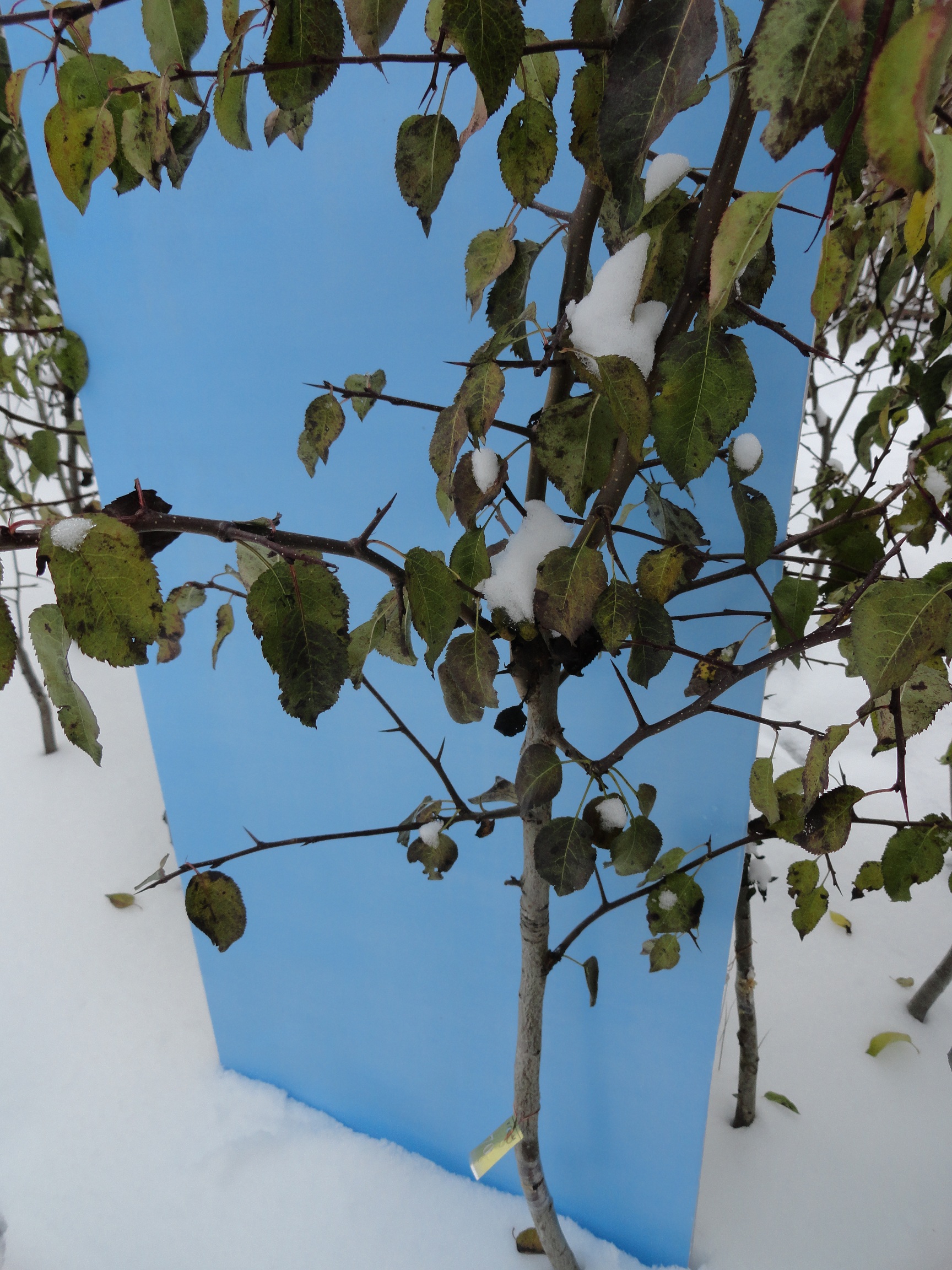 Эту зиму в округе, и у меня почти все семечковые плодовые деревья (взрослые, молодые на семенных, разных клоновых подвоях и вставках, саженцы и сами подвои) встречают в зеленой листве, пожухлой от небольших заморозков.