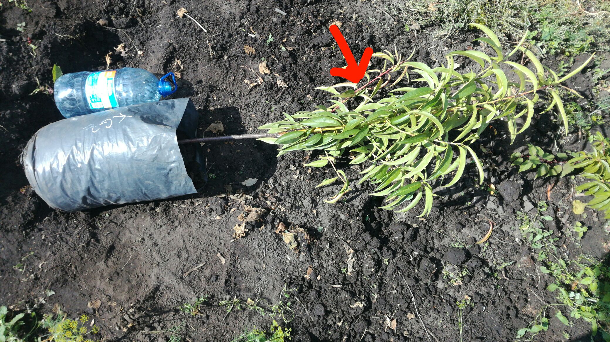 Вот пример, двухсортовой саженец прививки апреля этого года, подвой 11-19, сорт Клоун - полностью зеленые побеги, а второй омский (бубновский) - красный, обозначен стрелкой. Фото начала сентября, перед высадкой на постоянное место, для масштаба 5л бутылка из-под воды.