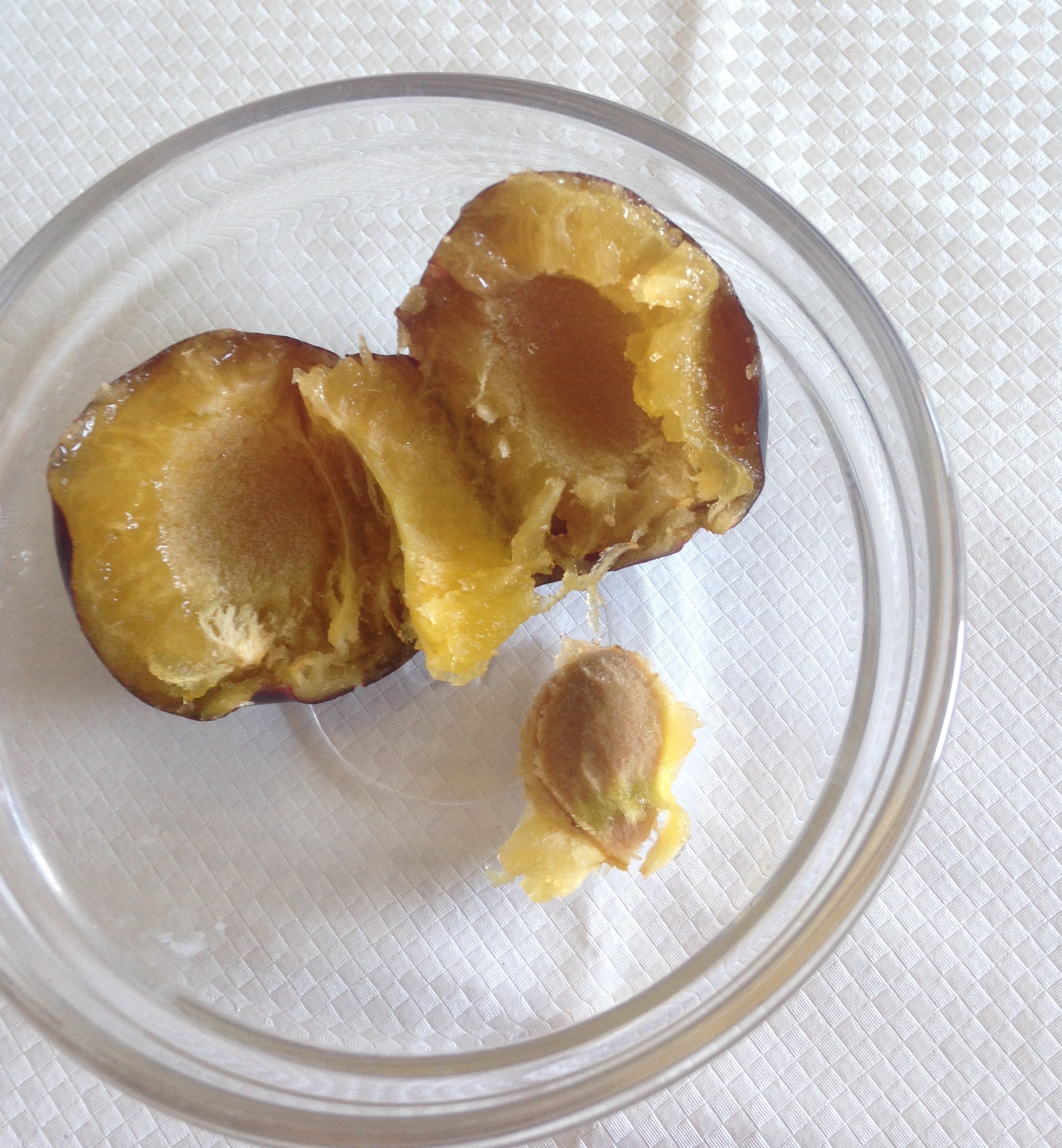 Слива вкусная, мясистая, но не хватает сочности в этом году, немножко "ватная" мякоть. Косточка мелкая, отделяется легко.