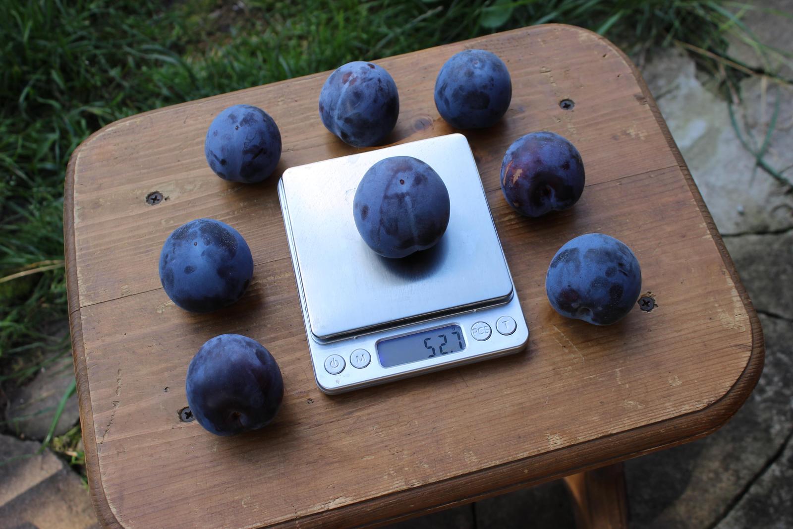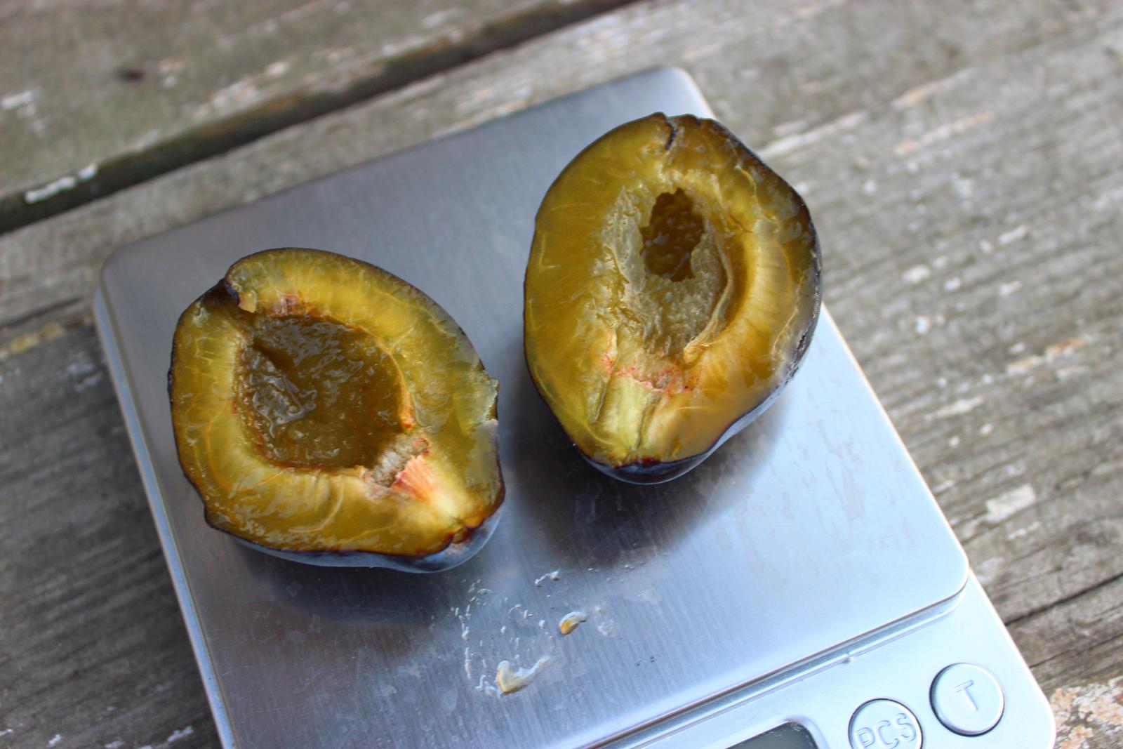 Слива очень выровненная, меньше 30 г. плодов нет. Большая часть в диапазоне 40-50 г. Вкус отличный. Косточка мелкая, отделяется не очень хорошо, у недозрелых плодов с трудом. Средняя масса косточки - 2.5 г.