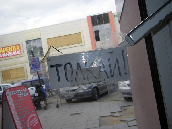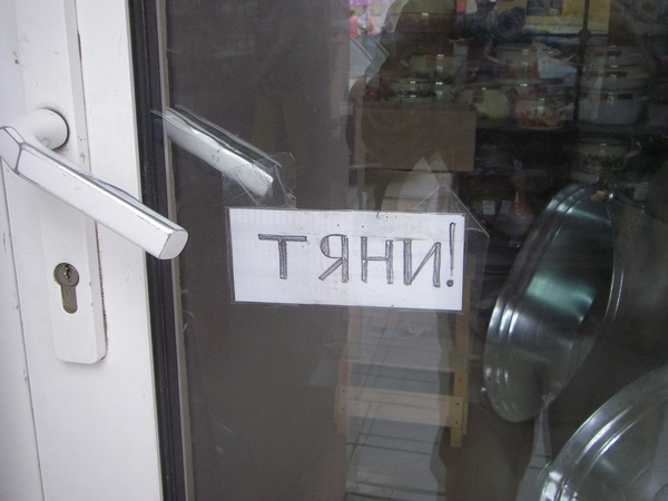 Вчера заехали с Михалычем в одно место, он пошел в рыболовный магазин за червяками, а я - в соседний посудный. Когда входила, не особенно обратила внимание, что у дверной ручки написано, но когда выходила... Вернулась в магазин и попросила разрешения сфотографировать: