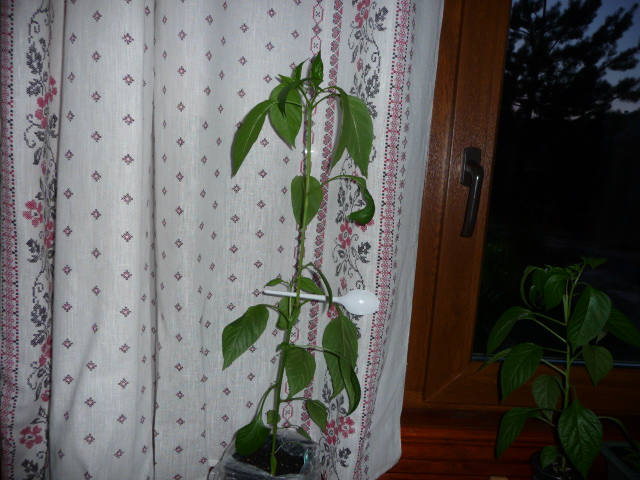Света - femina, после обрезки (макушка удалена в том месте, где ложка) перец выдал еще столько же в высоту и образовал развилку. То есть восстановился в прежнем виде, боковая выросла одна, слабенькая (слева, где ложка вставлена). Так и должно быть?