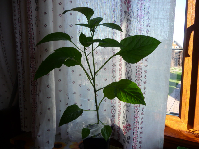 Этот сорт Болгарский от Тани-Кэти - после удаления верхушки . Сорт Giant Aconcagua -после удаления первого цветка "замер" -стоит себе задумавшись. Эти перцы посеяны в один день - как влияет на рост объем горшка. Вот такая погода у нас сегодня за окном!Людмила.