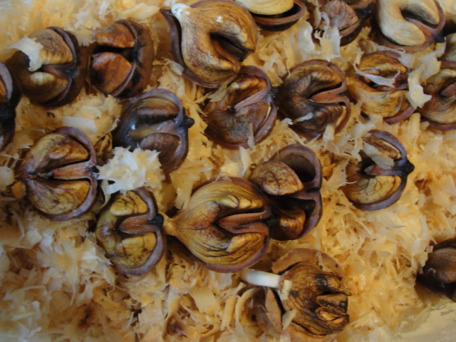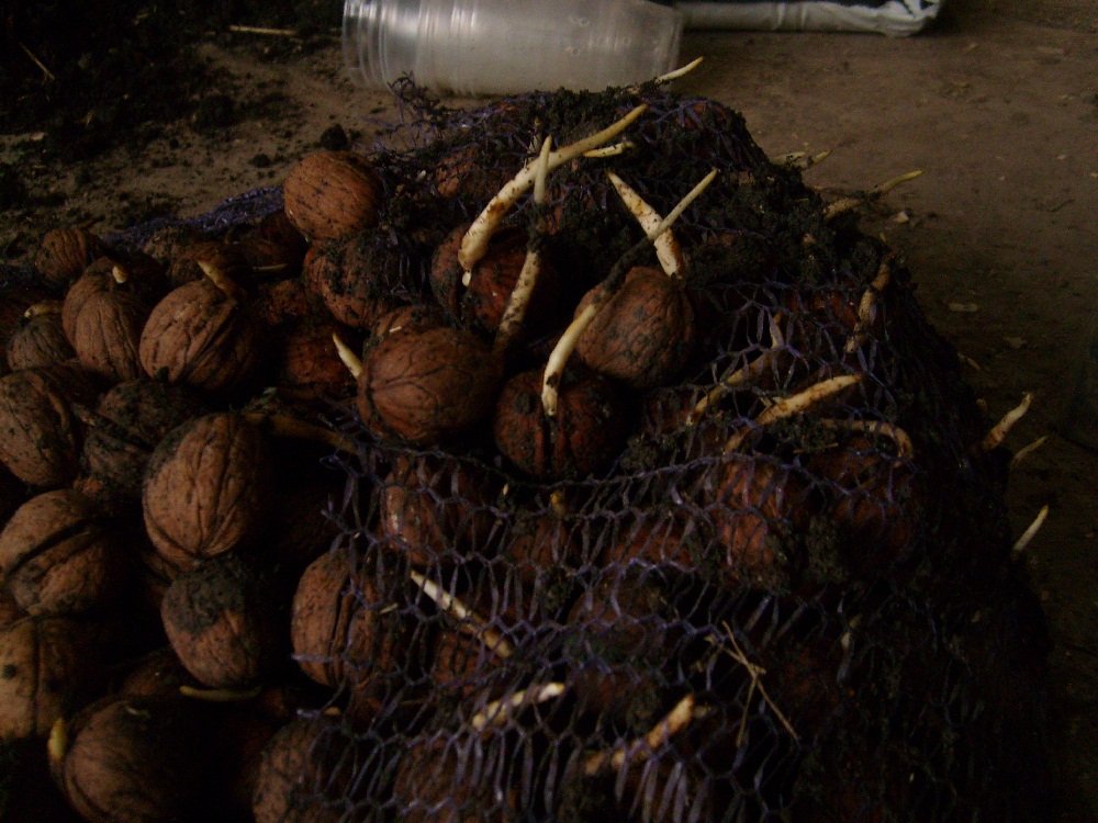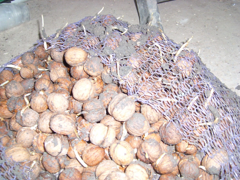 Осенняя стратификация ореха Кочерженко , вчера - сегодня начали доставать мешки , всхожесть - 100 % .