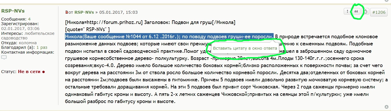 RSP-NVs писал(а): Никола(Ваше сообщение №1044 от 6.12 .2016г.); по поводу подвоев груши-ее поросли. В природе встречается подобное клоновое размножение данных подвоев; которые имеют свои преимущества и недостатки; по отношению к семенным подвоям. Подобные подвои испытал в своей садоводческой практике.Помог удачный случай. Я; лет 15 наэад;нашел в заброшенном саду одиночное грушевое корнесобственное дерево- полкультурку. Возраст -примерно 20лет;высота 4м.Плоды 130-140г.г.г.;осеннего срока созревания;вкус-4.0. Дерево имело большое количество боковых корней;близко расположенных к поверхности почвы; за счет чего вокруг дерева на расстоянии 3м от ствола росло большое количество корневой поросли. Десятка два;отделенных от боковых корней на расстоянии 2м;подвоев были высажены в питомнике. Причем 5 подвоев имели довольно развитую мочковатую корневую систему; а остальные требовали доращивания корней. На эти 5 подвоев был привит сорт Чижовская. Через 2 года саженцы примерно имели одинаковый габитус кроны и высоту. А пять 2-х летних саженцев Чижовской;привитых на сеянцы этой п/культурки; уже имели большой разброс по габитусу кроны и высоте.