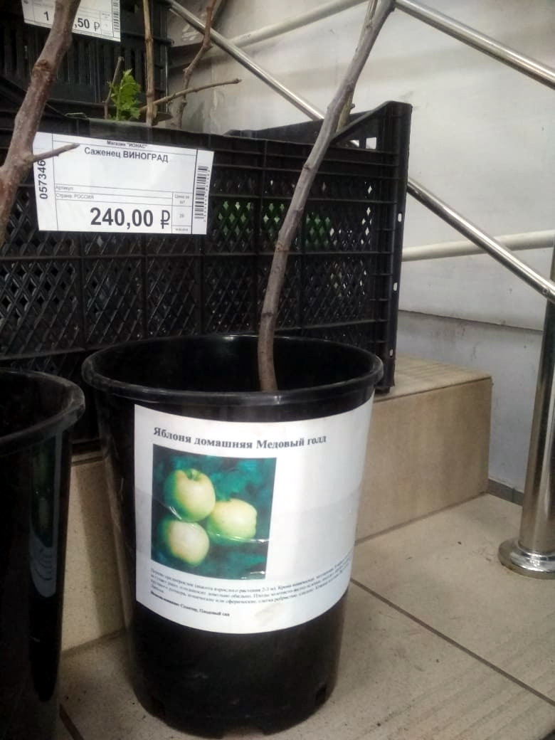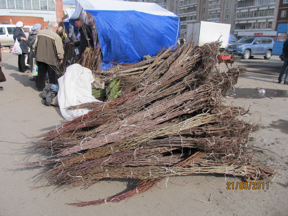 Но появились и некоторые новшества(к сожалению не сфотографировал). Все же время не стоит на месте. Саженцы продаются исключительно в контейнерах с ЗКС. Сейчас в ведь они в тренде.... Интересно то, что совершенно не стесняясь покупателей, в углу в пучках и мешках лежит то, что они потом втыкают в эти самые контейнеры. Тут же рядом в таких же контейнерах розы и виноград(по замыслу продавцов соседние с нами области только и занимаются выращиванием этих культур). Вид у винограда такой словно кто-то выкорчевал виноградники, нарезал и воткнул трехлетнюю лозу в контейнеры. Цены за яблони, груши и виноград по 320 руб. Розы по 130 руб. На вопрос продавца, какие розы? Флорибунда, чайно-гибридные или плетистые, ответ был лаконичный - "кустовые".