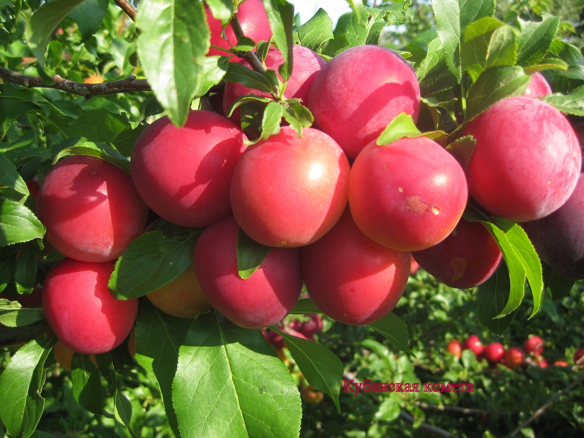 У нас созрели плода сливы русской Кубанская комета и Царская с опозданием к среднемноголетним примерно на 10 дней. Оптимальной потребительской зрелости пока достигли отдельные плоды. Сорт Царская плодоносит на прививке прошлого года. Плоды среднего размера (около 25 г), но очень нарядные, солнечные. Особенность сорта – мелкая, хорошо отделяющаяся косточка, вкус кисло-сладкий. Никакого абрикосово-дынного привкуса во вкусе не наблюдается.