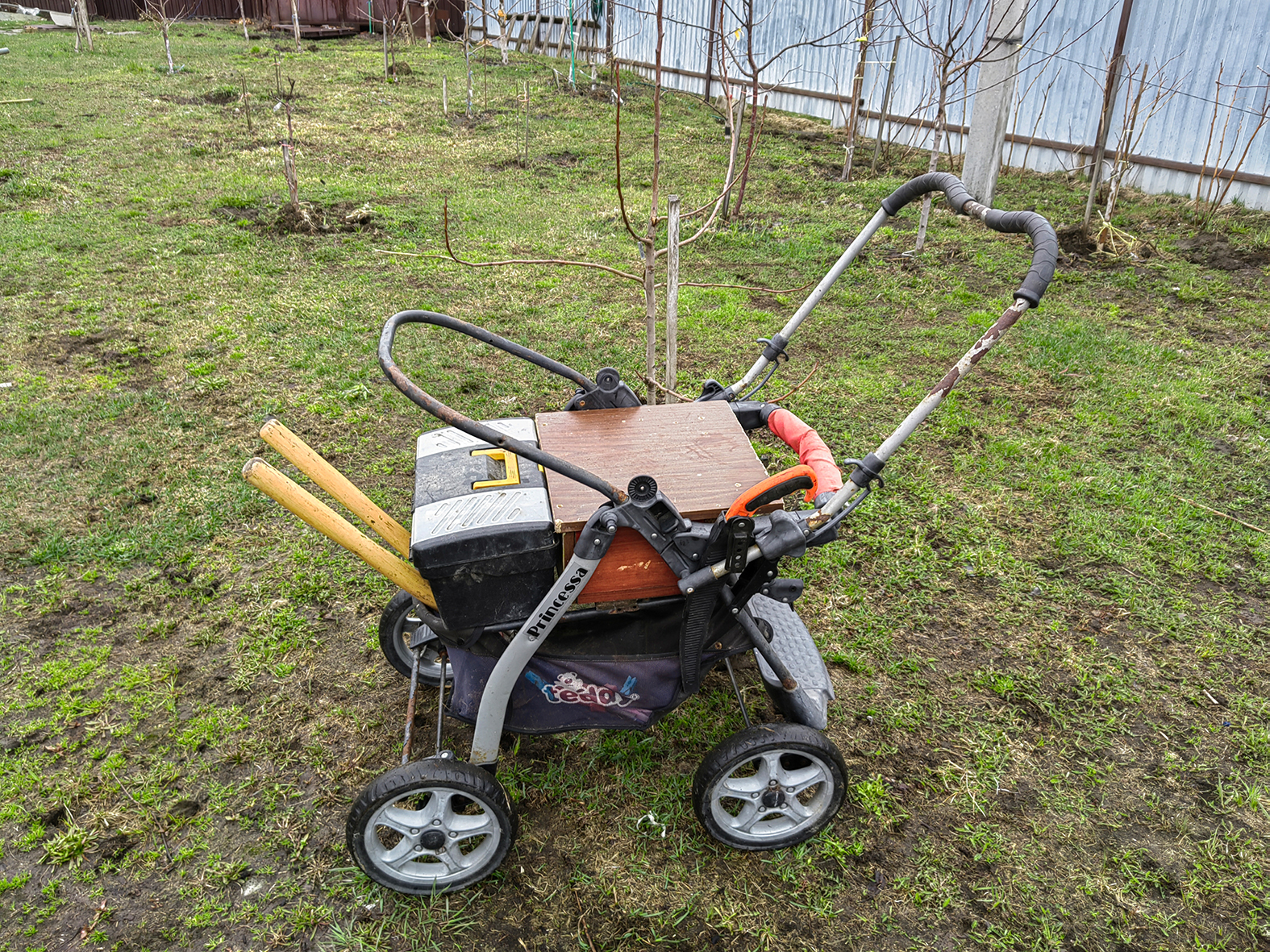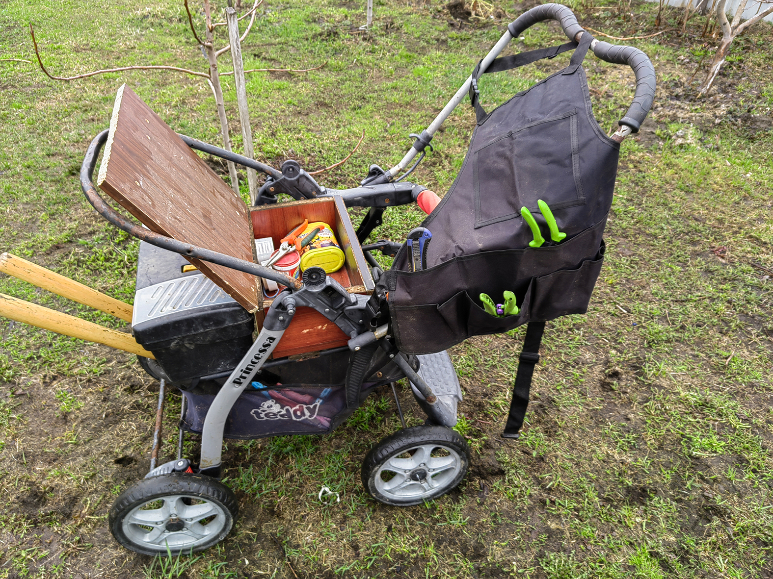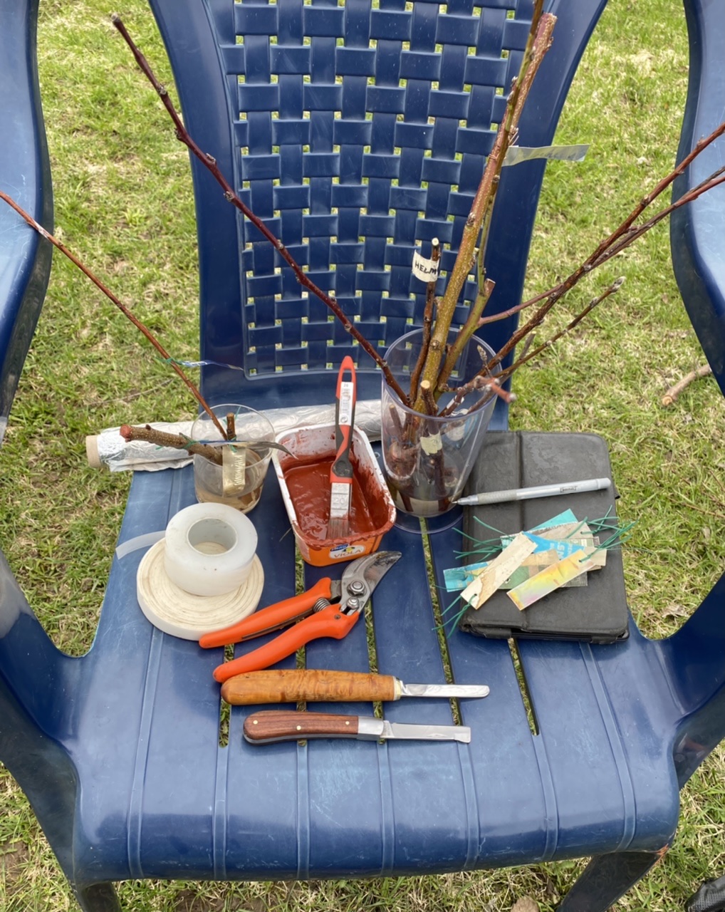 Уже давно прочёл у Курдюмова про табуретку. Попробовал - очень понравилось. По сути, небольшой переносной столик. С тех пор каждую весну на прививки беру только её. Самая незаменимая вещь когда гравируешь бирки старой шариковой ручкой. При работе на высоте всё необходимое умещается в нагрудных карманах.