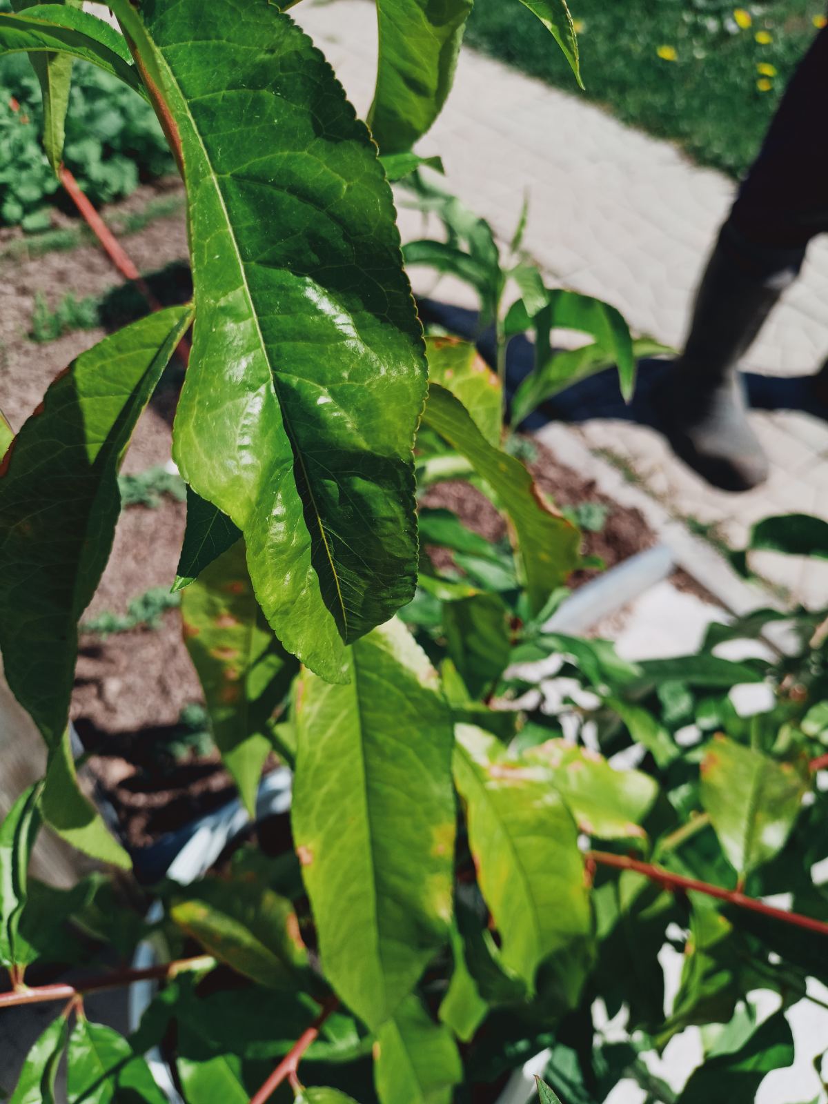Подскажите, пожалуйста, почему у персика в контейнере листья становятся желто-оливкового цвета и небольшие пятна некроза? Поливаю регулярно, 2 раза подкармливала и обрабатывала от болезней. Может это быть хим.ожогом? Привито несколько сортов на сеянец персика