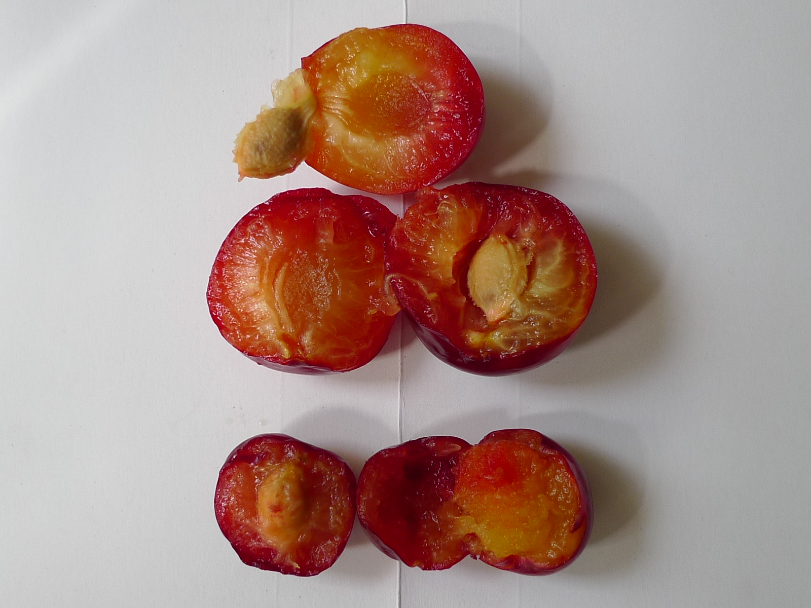 У И.Р. в состоянии полной зрелости косточка практически полностью отделяющаяся. У Асалоды косточка сросшаяся с мякотью, по абсолютному размеру сходна с косточкой И.Р., но относительно небольшого размера плода составляет значительную его часть.