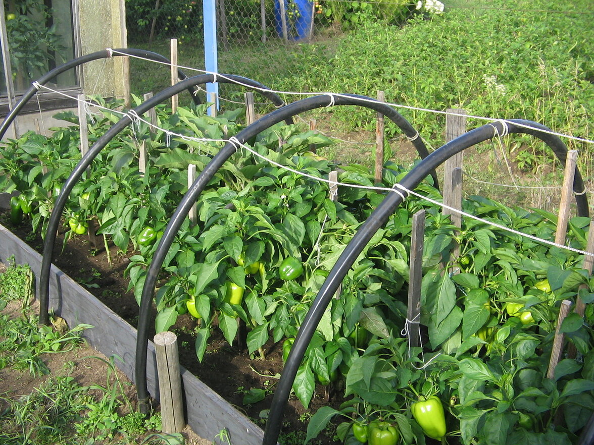 Николай здравствуйте! Если заинтересует, то я добавлю в эту тему свой опыт. Грядки приподнятые в ОГ я делаю шириной 60-70 см . Длиной -4-5 метров. Большую ширину считаю не оптимальной, ибо сажаю томат только в один ряд для обеспечения лучшего продува воздухом, да и легче делать все работы затем по уходу за растениями(с двух сторон грядки). Обьема грунта в таком варианте вполне хватает с избытком, ибо для одного куста достаточно 5-10 литров . Высота насыпного грунта(субстрата) в грядке в районе 20 см. Отсюда и высота полос шифера(досок) -40 см(10 вниз+20 на грунт+10 на борт). Дуги использую 3 метровые(в прямом виде) , в дуге они дают высоту по центру 80 см (если их вдавить в землю на 10-15 см). Ставлю их через 1-1,2 м. Вверху дуги скрепляю шнуром(веревкой) в три линии для устойчивости конструкции. Как ниже на снимке. Шнур использую только полиэфир, остальные материалы быстро разрушаются на солнце. После высадки рассады нарываю НУМ, сверху п/э пленка . По мере потепления сначала убираю пленку, затем (при необходимости ) и НУМ. Хотя на перцах, баклажанах НУМ находится иногда почти до конца вегетации.