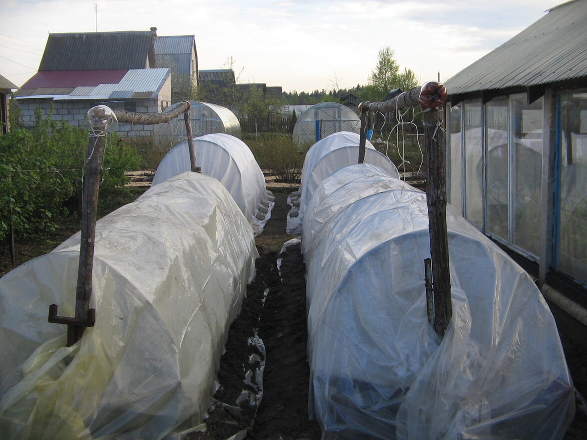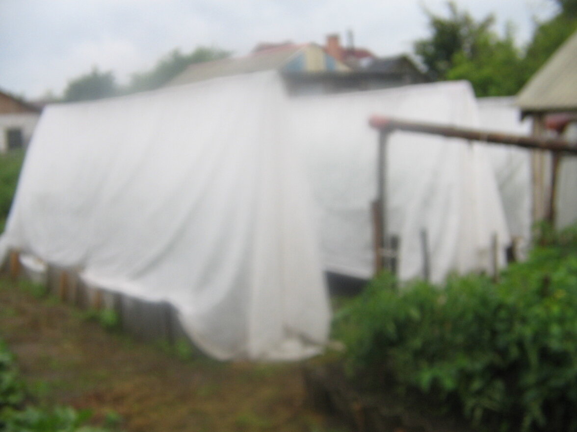 Николай! Схема накрывания в зависимости от погоды все время меняется. После высадки рассады в ОГ ( у меня это начало-середина мая) тоннель накрывается сначала НУМ(у меня это марка 60),сверху пленка.Утром (в зависимости от Т воздуха) или на пленке открываются только торцы, или вся пленка снимается (на день) .Нум пока весь май практически не снимается(только для полива и обработки). И под пленкой всегда должен быть НУМ, что исключает капли влаги на томаты. В конце мая-начало июня пленка убирается. А вот НУМ -по ситуации. Причем , если кусты уже выше дуг, то НУМ набрасывается (в случае чего) уже на горизонтальную шпалеру(высотой 1,8 м.) над тоннелем(ее видно на нижнем фото). Для это цели у меня специальные полотна НУМ 4 м на 8 м. Такой размер по ширине позволяет прижать к земле НУМ по обоим краям , а по длине закрыть и торцы как на фото .