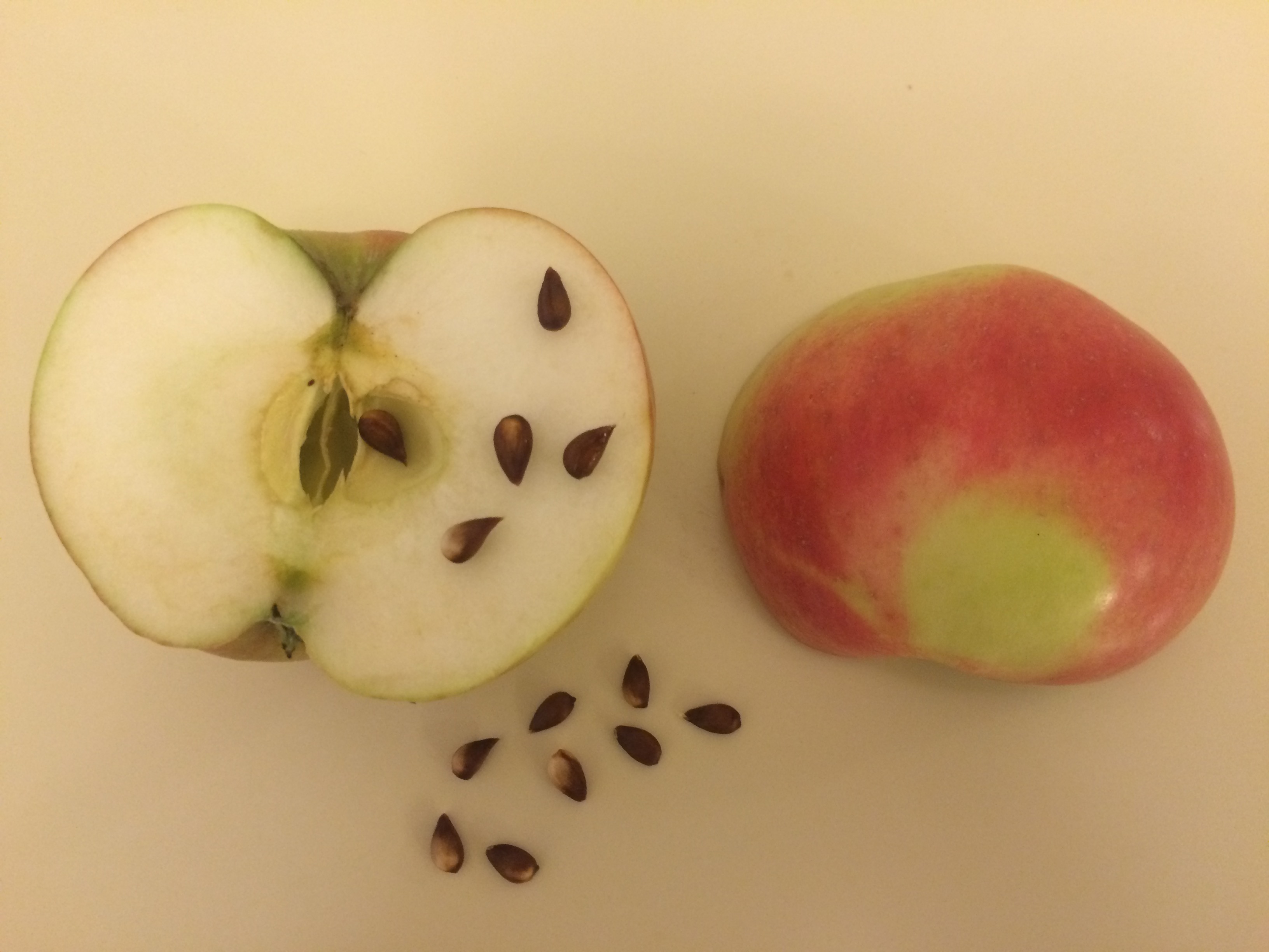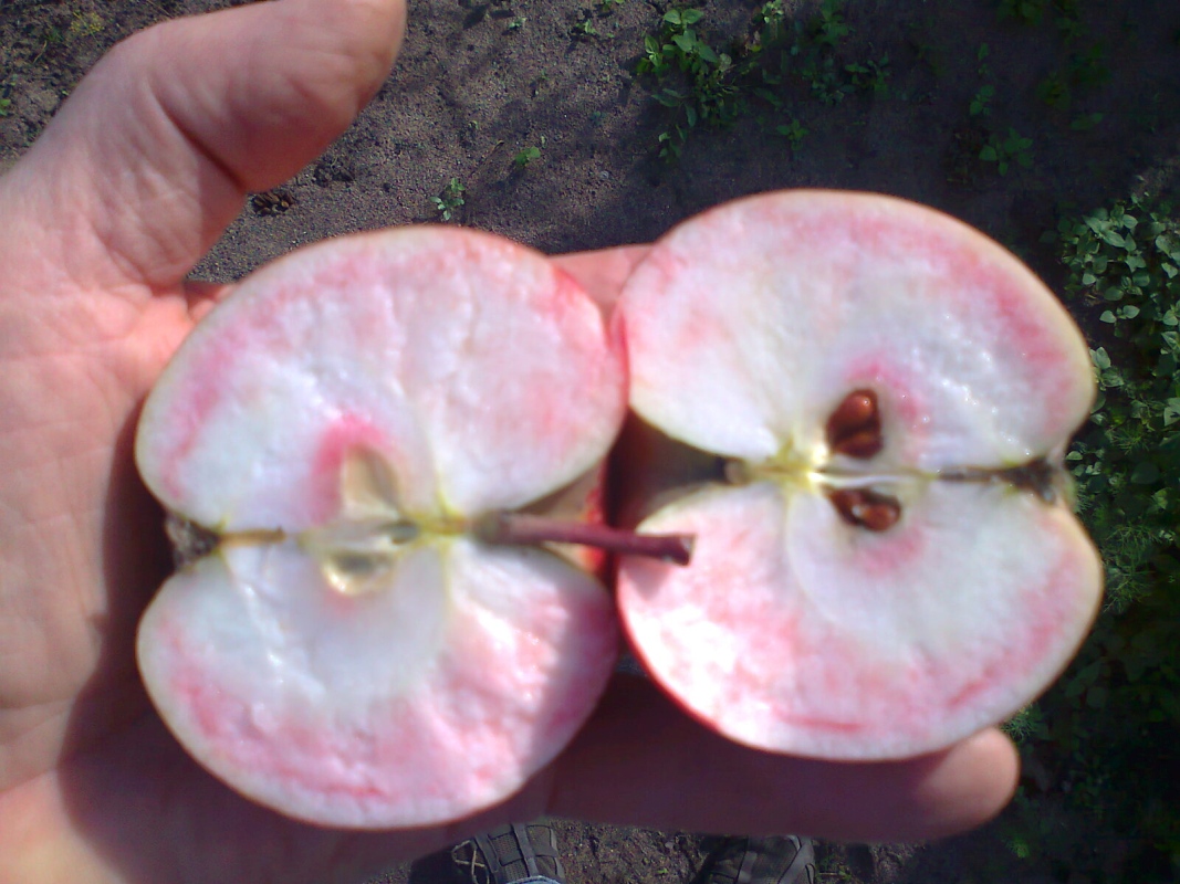 У соседа моего соседа (на параллельной улице) растёт яблоня, цветущая розовыми цветами, яблоки с розовым румянцем и розовой мякотью. Я не поверил и сосед стырил для меня одно яблоко. Яблоко сочное, приятного кисло-сладкого вкуса без терпкости и горчинки, мякоть розовая, немного жестковата. 22.09 было недозрелое и должно было ещё полежать. Сосед сказал, что это зимний сорт и у спелого яблока мякоть более интенсивного розового цвета. У кого-нибудь есть мысли, в какую сторону искать название сорта?