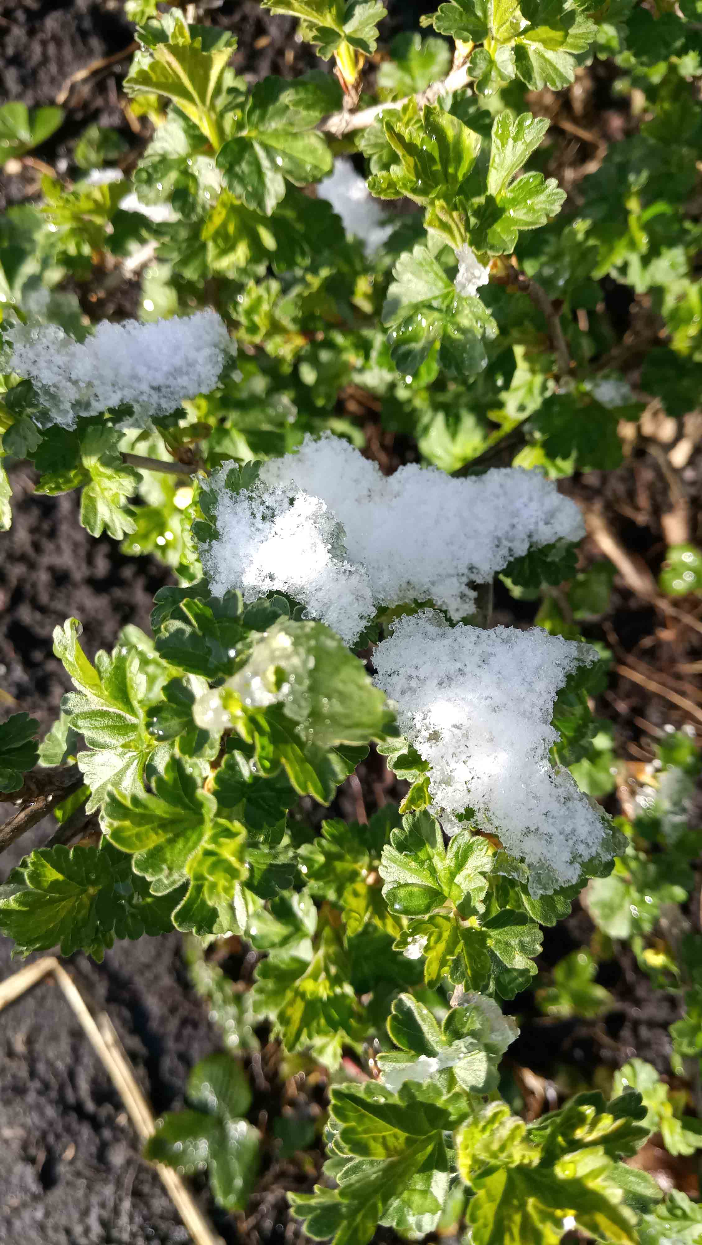 Сегодня утром все было белым-бело. Не успела сделать заснеженные фотки. Под лучами солнца снег стал стремительно таять. Вот в таких условиях цветет в этом году крыжовник.