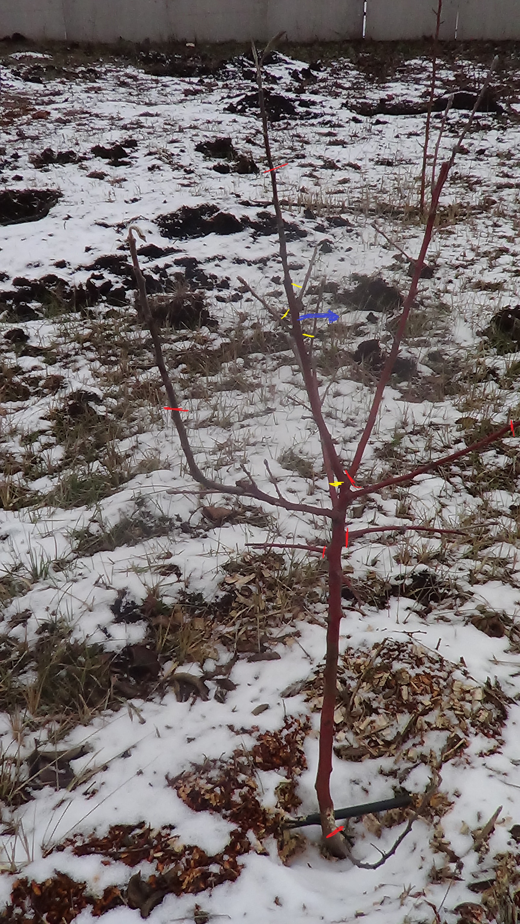 Красным помечены места предполагаемой обрезки, желтым- установка "зубочисток", синим- изменение положения веток/саженца.
