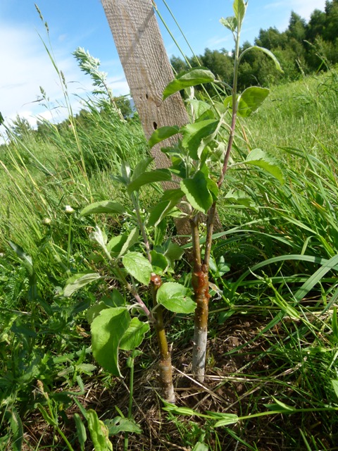 Немного об успехах: да год у нас задался "урожайный"! Груш мало, слив и вишни по всей Твери нет...Садовая земляника еще спеет (1 июля!!!), жимолость только-только отошла. Пожалуй, только ранние яблоки будут, но везде слизни-слизни, эпитофия! Между тем, несмотря на такую весну и холодное лето (или даже благодаря, потому что мы капельную систему вот-вот монтируем) яблоньки с зимней прививки взошли и принялись без полива, маточник подвоев 54-118 вообще без выпадов (на данный момент). Самое сложное, конечно, зима. Но это увидим. Напомню, я тот неопытный новичок, что всем на 112 странице рекомендовал в Беларусь за черенками ехать и тот, который без особого опыта закладывает сад в Тверской области. Акромя посадки зимних прививок, я прививал дикарки с полей. Я просто угорел - сокодвижение в марте началось, земля на две лопаты прогрелась - начал прививать, потом снег, оттепель, снег, сами видели, в итоге в конце мая закончил. Все почти делал секатором - более 1000 веток. Короче замудохался, руки от секаторов болят. Многие черенки уже пошли в рост, многие распускаются. Рассчитываю, если 60% привьется, то это просто шикарно. На данный момент около 80 процентов. Но уже видно, что сортов 70 сохраню, так как черенков и прививок было очень много. (имеется в виду до зимы:), а потом посмотрим). Фотки ниже