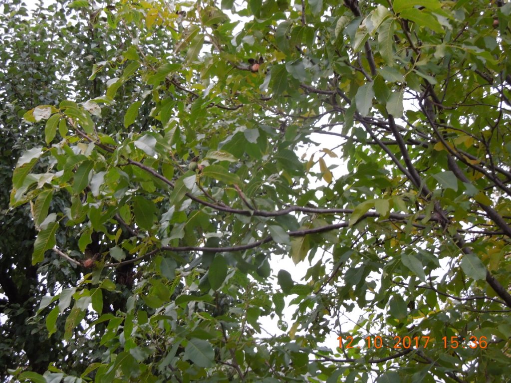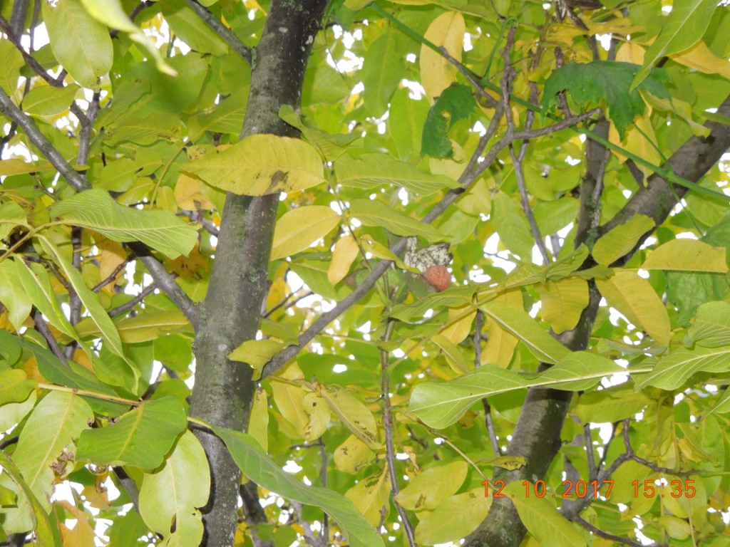 У великовозрастного маньчж. ореха - период листопада. На дереве еще 1/3 листьев и отдельные плоды.