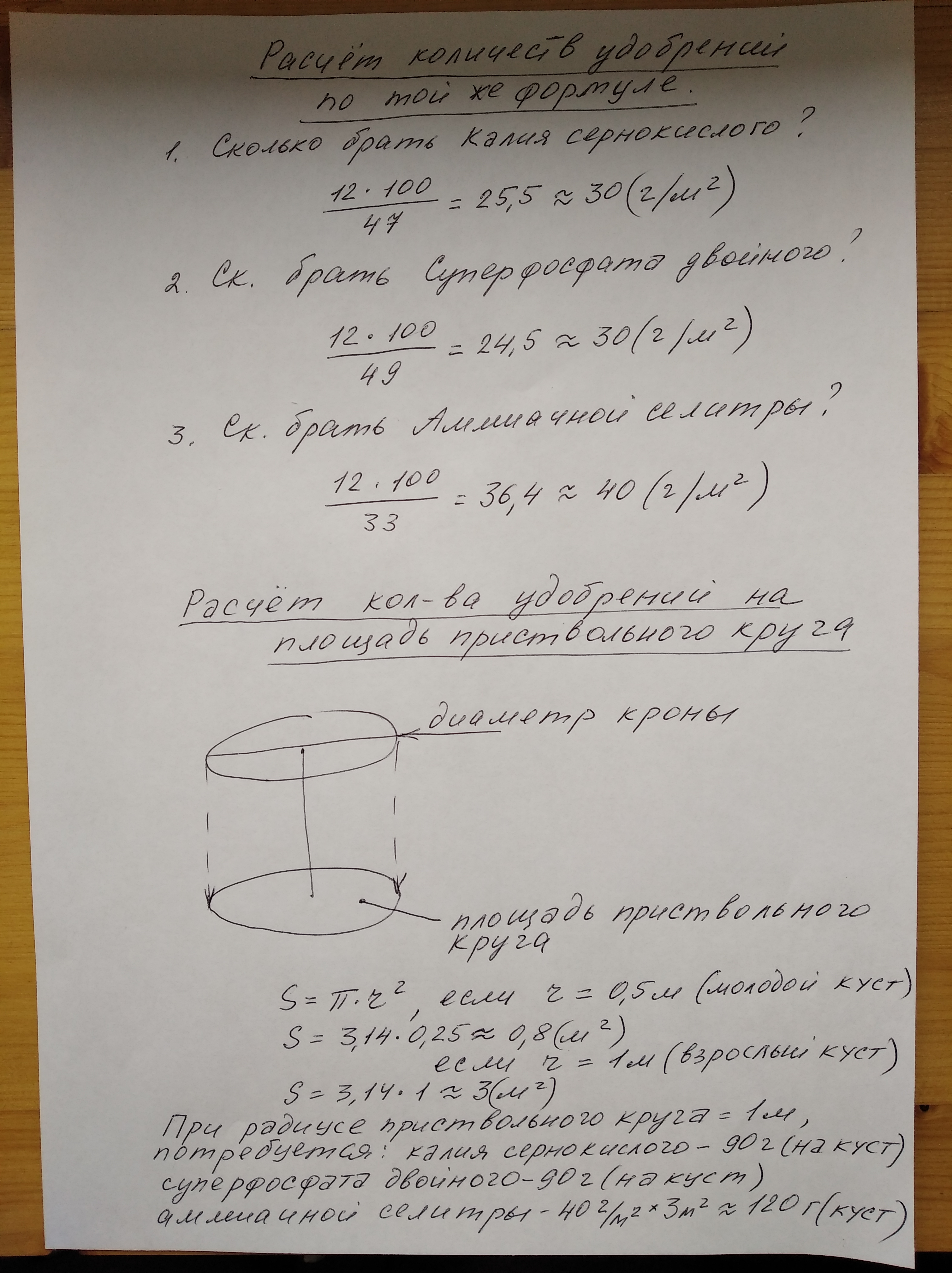 Zaryanka, спасибо за подробно изложенную методику расчета. Сегодня утром внес под крыжовник 20 г селитры калиевой. По приведенной методике проверил количество внесенного калия. С учетом раннее внесенной 20 г нитроаммофоски и диаметра кустика крыжовника 0,7 - 0,8 м, получилось 26 г д.в. на м. кв.