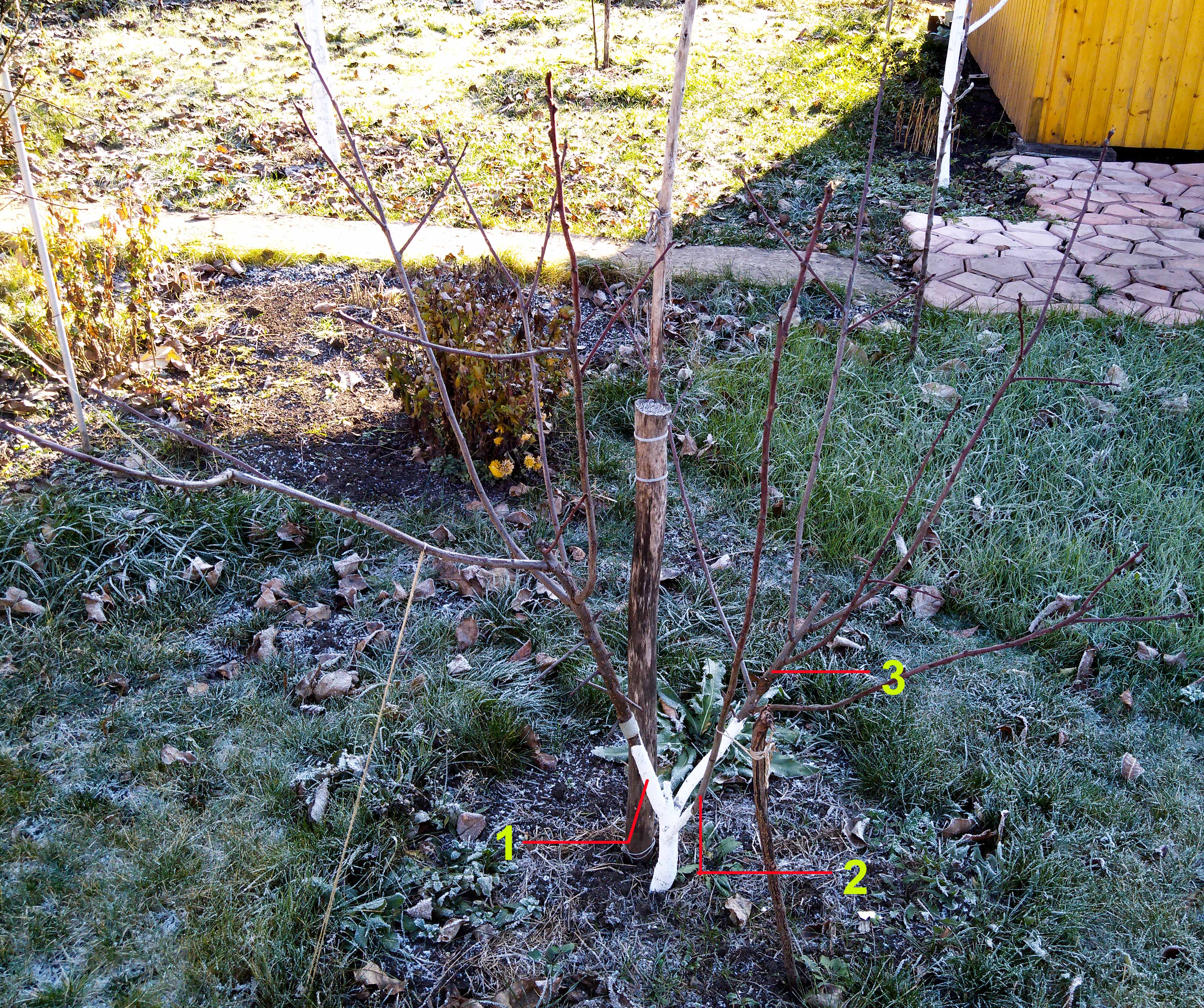 Прошу совет. Есть слива - 2 года. Покупал как алычу, поэтому начал формировать как куст. Когда понял, что слива и наверно сильно рослая, задумался правильно ли оставлять такую формировку. Может удалить ветви 2 и 3, а ветвь 1 выравнять, подтянуть вправо, и из нее формировать чашу?